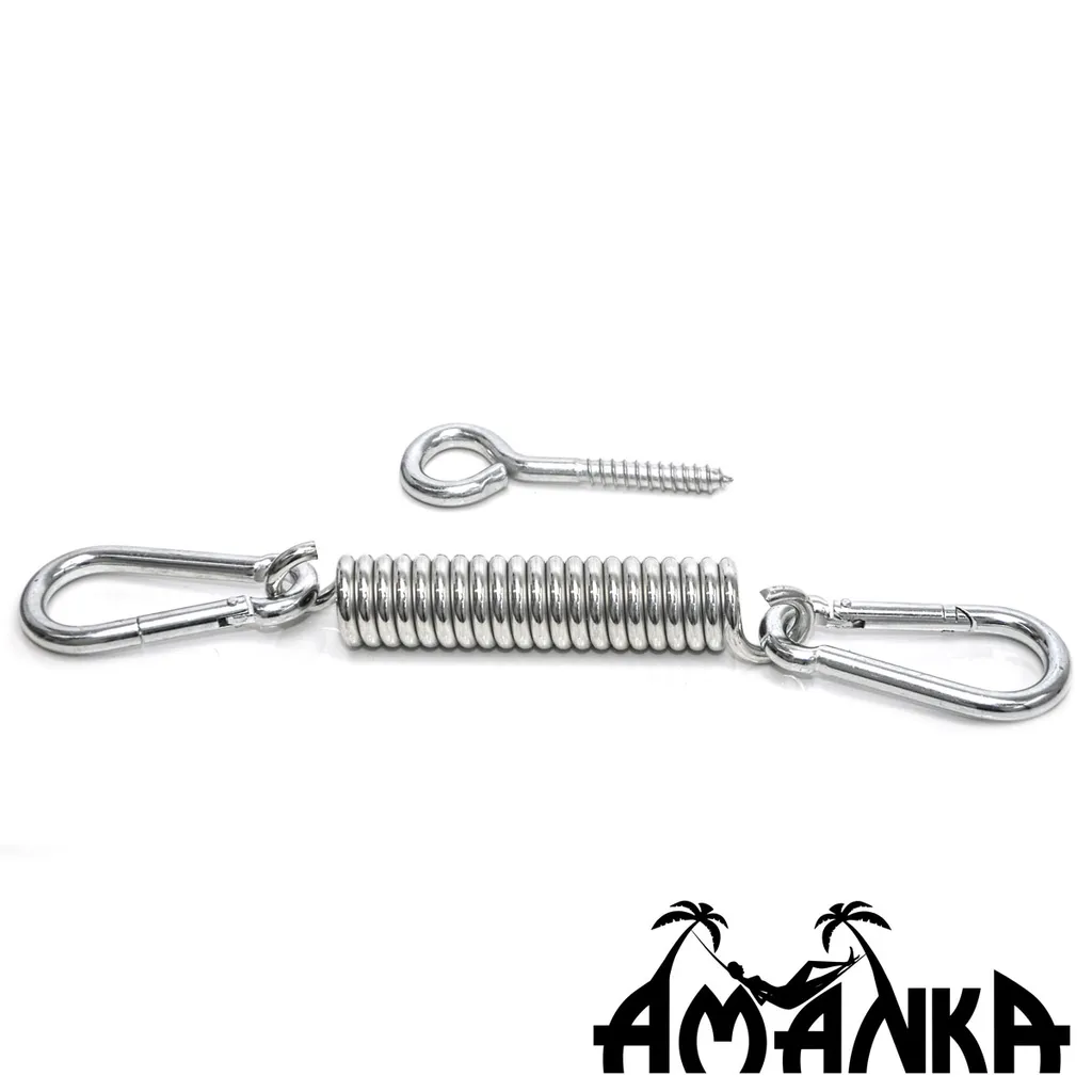 Dieses schwere Metall Befestigungsset wurde speziell für Hängestühle entwickelt. In Holz, wie z.B. in einen Deckenbalken, schrauben Sie die starke Ringschraube fest ein. Bei einer Betondecke müssen Sie nur mit einem handelsüblichen Bohrer das Loch bohren und die Schraube in einen passenden Dübel befestigen. Bei einem Hängestuhlgestell haken Sie nur den Karabinerhaken ein und verzichten auf die Ringschraube. Die 2 großen Karabiner halten die Schwingfeder sicher in ihrer Position. Die Metallfeder gibt elastisch nach und federt Sie sanft in Ihre Wunschposition.