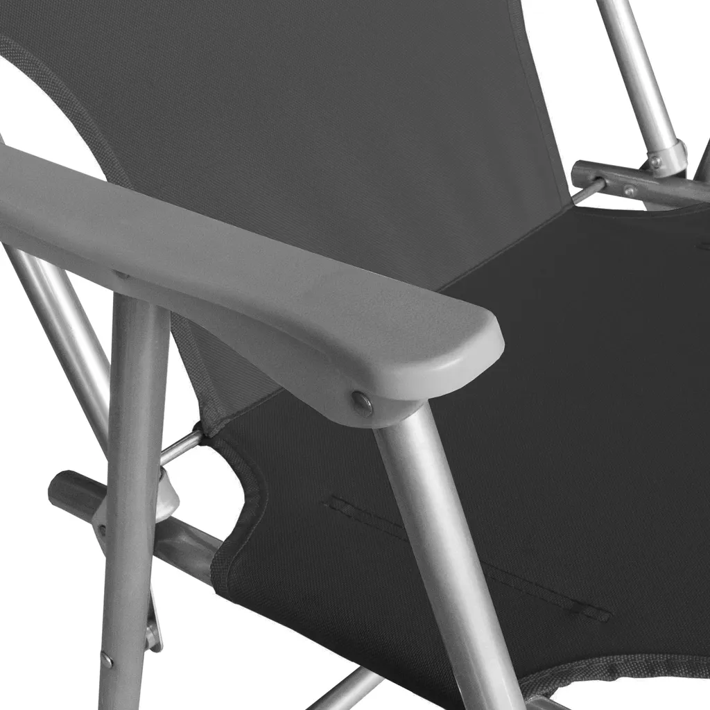 Die besonders leichten Campingstühle besitzen strapazierfähige Sitz- und Rückenflächen aus pflegeleichtem schwarzem Polyestergewebe. Die Stuhlgestelle wurden aus silberfarbenem Metall gefertigt und sind mit grauen Armlehnen ausgestattet. Durch das pflegeleichte Material und die unempfindlichen Farben ist die Sitzgruppe ideal für den Einsatz im Freien geeignet.