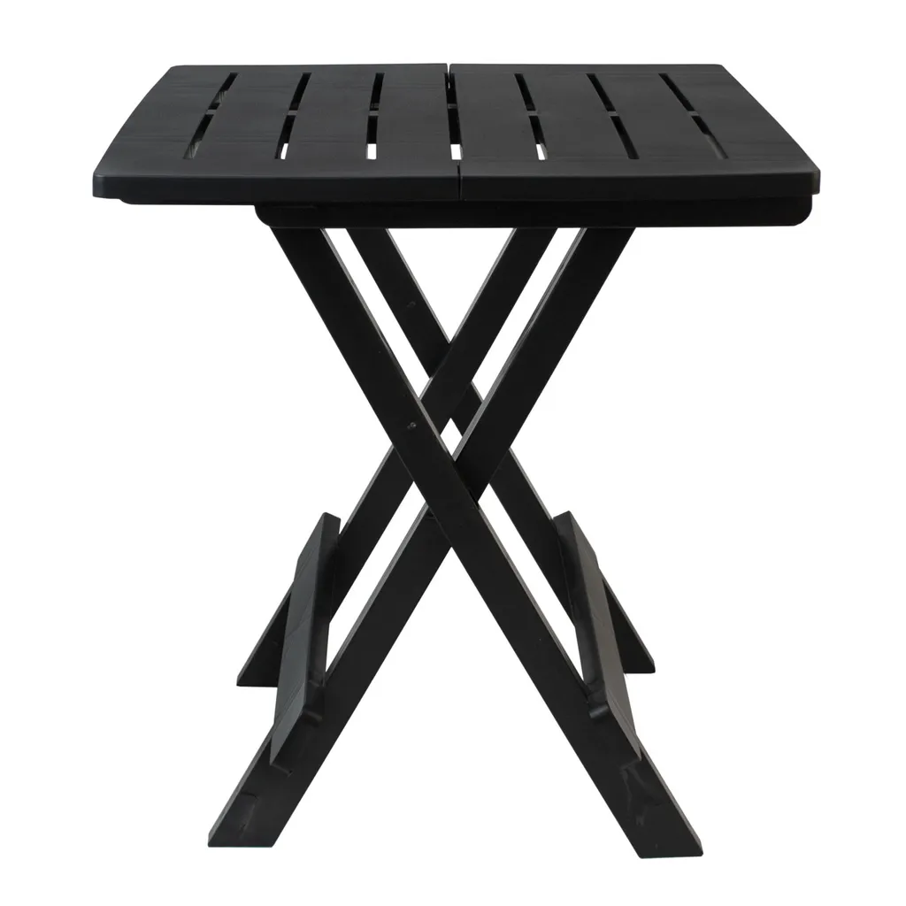 Moderne und flexibel einsetzbare Garnitur für Balkon, Garten, Camping oder Reise. Alle 3 Teile können schnell auf- oder zugeklappt werden, dadurch ist diese Sitzgruppe die perfekte Lösung für alle, die Mobilität und Flexibilität lieben. Der 45cm breite und 43,5cm tiefe anthrazitgraue Kunststofftisch bietet genügend Platz für Snacks und Getränke.