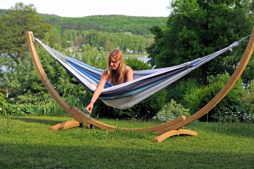 Das Hängemattengestell Apollo von Amazonas: Der kleine Bruder von Olymp, ist aus demselben Holz , denselben Beschlägen und natürlich mit der gleichen Sorgfalt hergestellt. Speziell geeignet für die Hängemattengrößen L oder kleiner (z.B. Lambada, Brasilia, Banana, Aruba, St. Lucia, Jamaica).