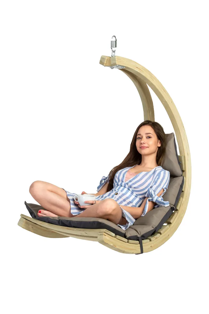 Swing Chair ist als perfekt ausbalancierter Schwebesessel im AMAZONAS-Gestell „Globo Stand“ (nicht im Lieferumfang enthalten) oder sanft schwingend an einem Baum bzw. an der Zimmerdecke hängend, verwendbar. Inklusive Spiralfeder.