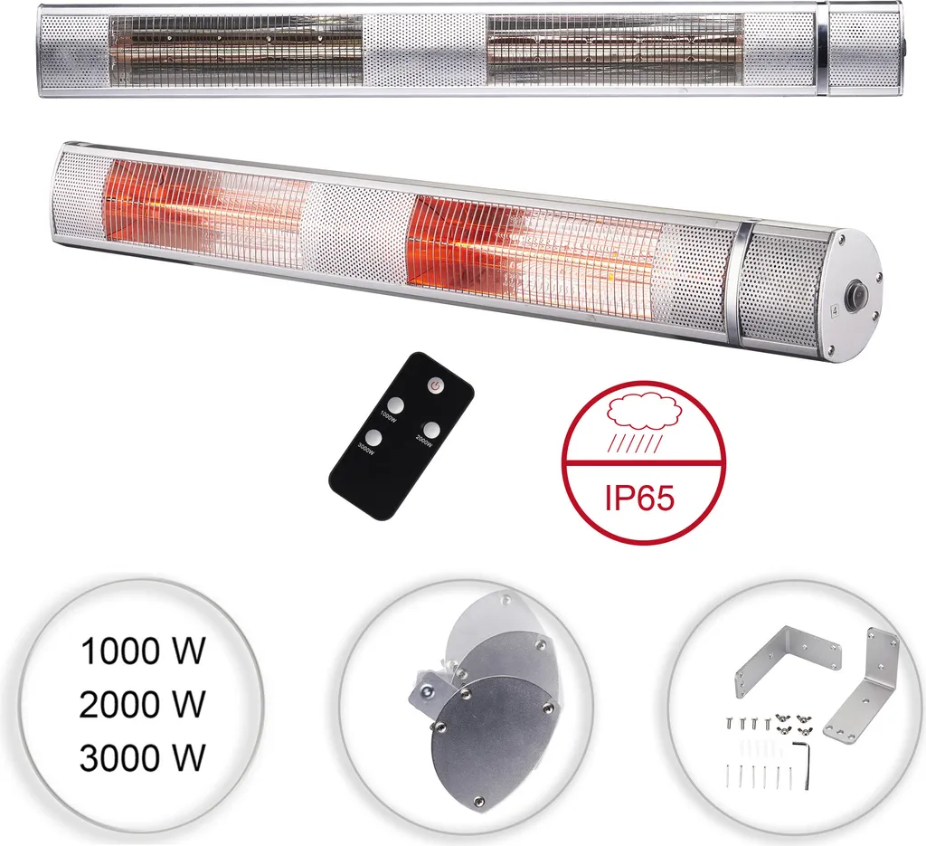 Der flexible Wärmespender lässt sich dank Befestigungsmaterial schnell auf- und abbauen. Die Heizleistung beträgt 3000 Watt und ist somit besonders leistungsstark. Wählen Sie zwischen 3 Heizstufen (1000W/2000W/3000W). Durch die Infrarot-Technologie arbeitet der AREBOS Heizstrahler äußert effizient: Die Wärme strahlt nicht in die Umgebungsluft, sondern gezielt an Personen in der Nähe ab.