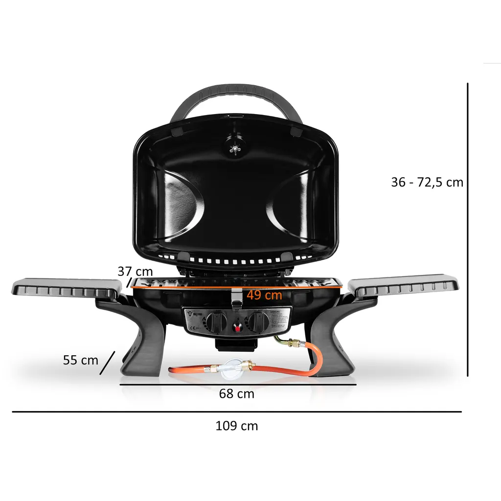 – Maße (Gasgrill mit Seitenablage): (B) 109 x (T) 55 x (H) 36 cm