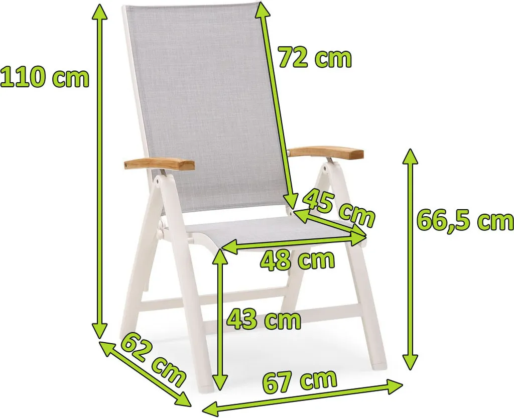Gute Eigenschaften des Gestells aus Aluminium sind eine hohe Beständigkeit gegenüber Regen und übermäßiger Sonneneinstrahlung. Das Material benötigt nur wenig Pflege und kann bei Bedarf mit einem Lappen und Wasser vom Schmutz befreit werden. Das Material der Sitzebene und Rückenlehne ist Ergotex-Gewebe. Wetterfestigkeit und Robustheit gehören zu den Charakteristiken von Ergotex-Gewebe. Für die Säuberung reicht ein feuchtes Tuch oder ein Haushaltsschwamm aus. Bei störrischen Flecken benutzen Sie eine milde Seifenlauge gepaart mit warmen Wasser. Bei dem Produkt verläuft das Zusammenklappen unkompliziert. Somit können Sie es, bei Bedarf, platzsparend wegräumen. Ausgezeichnet sind die Verstellmöglichkeiten, wodurch Sie in der Lage sind schnell die Position zu verändern. Durch das geringe Eigengewicht von 7 kg ist der Stuhl ohne große Mühe umpositionierbar. Mit einer Sitzhöhe von 43 cm hat das Möbelstück eine gute Höhe zum Sitzen. Dank der vorteilhaften Sitzbreite von 48 cm haben Sie außerordentlich viel Platz zum Sitzen.
