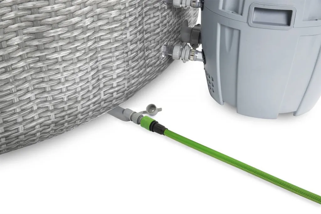 In dem selbstaufblasenden Whirlpool können sich bis zu 6 Personen angenehm entspannen. Der leicht auf- und abbaubare Whirlpool ist aus robustem TriTech-Material in grauer Rattanoptik gefertigt. Dabei wird eine Schicht aus Polyester-Netzgewebe von 2 PVC-Schichten umgeben. Für ein komfortables Massageerlebnis ist der Whirlpool zudem mit 120 leistungsstarken AirJets ausgestattet. Zusätzlich besitzt der Pool ein automatisches Start/Stopp-Heizsystem mit stromsparender Zeitschaltuhr. Die Pumpe und Heizung des Pools sind zur Sicherheit mit einem Fehlerstromschutzschalter (220-240V/ 50HZ/2.050W) versehen. Für eine einfache Bedienung ist die Pumpe digital steuerbar. So können sämtliche Funktionen wie Heizung (1,0-2,0 °C/h), Reinigung (Filterleistung von ca. 1.325 l/h), Massagedüsen, Luftbefüllung/-absaugung und Zeitschaltuhr per digitalem Bedienfeld gesteuert werden. Der Whirlpool verfügt über eine Kapazität von 916 Liter und ein Füllgewicht von 954 kg. Dank praktischem Ablassrohr wird auch der Abbau des Whirlpools zum absoluten Kinderspiel! Darüber hinaus ist beim beheizbaren Whirlpool mit Luftdüsen eine aufblasbare Abdeckung mit Clipverschlüssen, der ChemConnect Chemikaliendosierer, zwei Filterkartuschen und ein selbstklebender Reparaturflicken enthalten.
