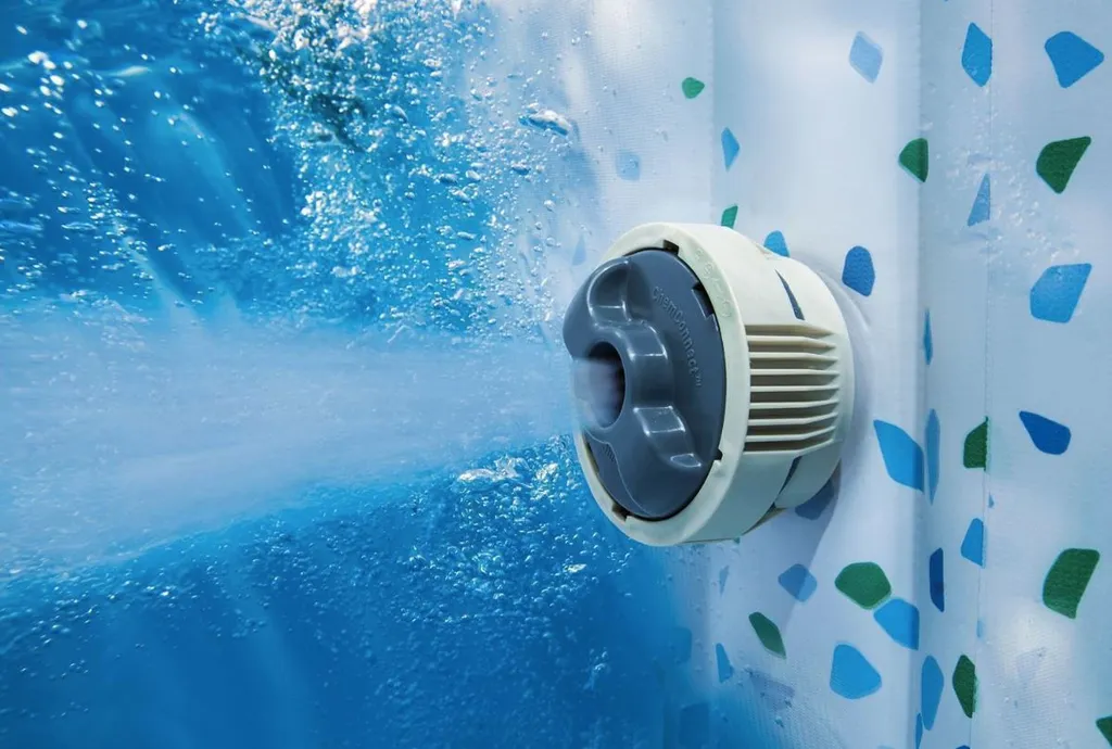 Das Wasser lässt sich mit Hilfe der Steuereinheit auf bis zu 40° C erwärmen. Pro Stunde erwärmt sich das Wasser um ca 1,5-2° C. Am besten daher die Pumpe mit genügend Vorlauf einschalten. Die Massagefunktion erfolgt über 120 am Rand befindlicher Düsen. Bei der Filterung und der Heizung gibt es eine automatische Abschaltfunktion die nach 72 Stunden aktiviert wird. Die Bedienung erfolgt über ein digitales Bedienfeld an der Oberseite der Steuereinheit. Hier können Sie auch die Wassertemperatur regeln.