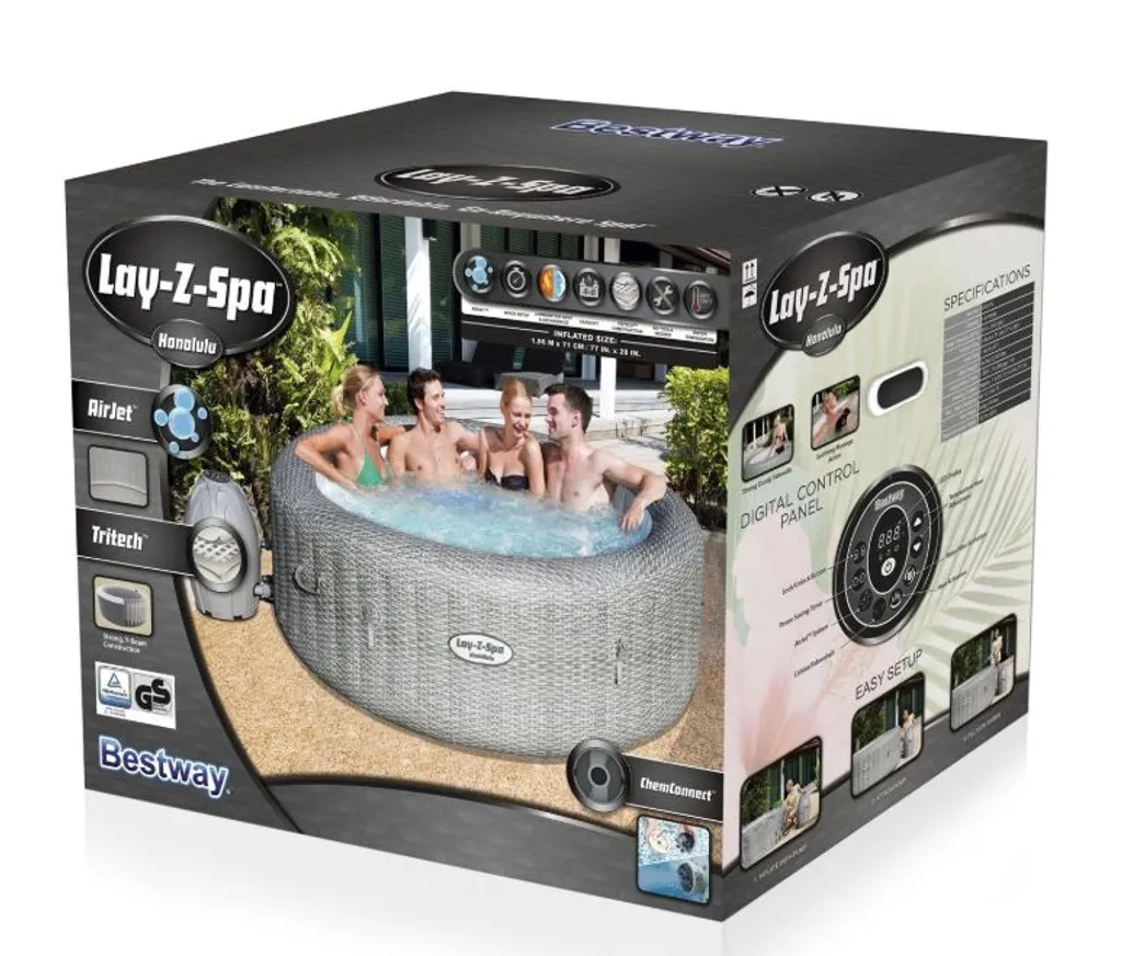 Haben Sie sich auch schon immer eine Wellness-Oase für zu Hause gewünscht. Der Lay Z Spa Honolulu von Bestway bietet eine komfortable Lösung für kleines Geld. Der Whirlpool mit 120 Düsen eignet sich sowohl für den Indoor- wie auch den Outdoor Betrieb. Der Whirlpool bietet Platz für 4-6 Personen. Der Whirlpool ist aus 3-lagigem TriTech-Material in grauer Rattanoptik und dadurch besonders robust!