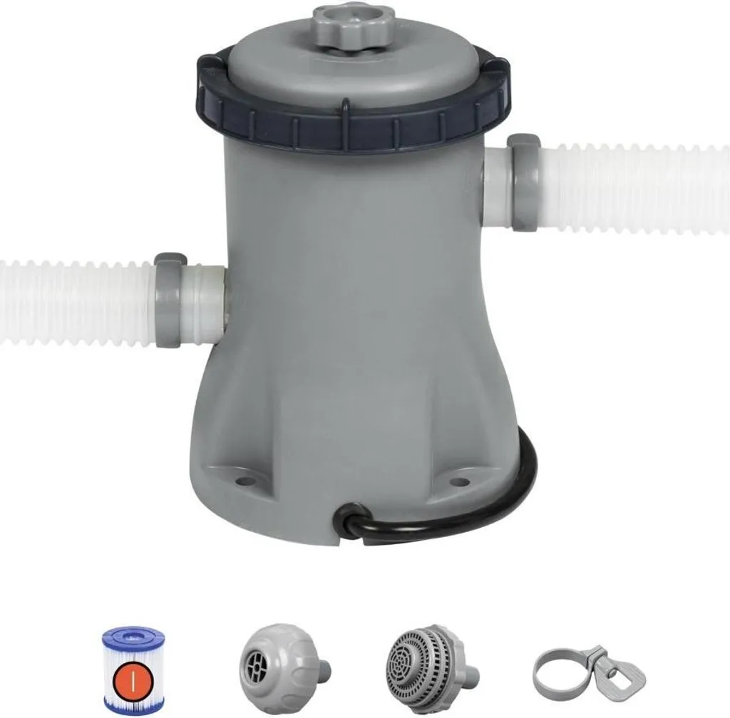 Mit dieser Filterpumpe bleibt das Wasser in Ihrem Schwimmbad länger klar und sauber, sodass Sie das Wasser nicht austauschen müssen. Die Pumpe ist benutzerfreundlich und lässt sich mit den entsprechenden Anschlussstücken leicht anschließen. Der mit der Pumpe mitgelieferte Filter Typ I sollte wöchentlich gereinigt und nach vier Wochen ausgetauscht werden. Die Pumpe zirkuliert und filtert 1249 Liter Wasser pro Stunde, um Schmutz aus dem Wasser zu entfernen. Achtung! In diese Filterpumpe passen ausschließlich Bestway Filter.
