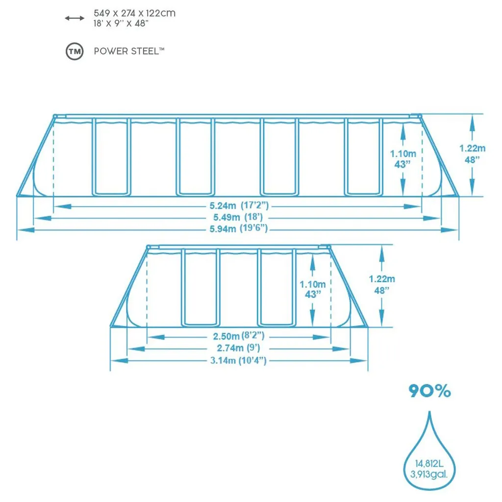 Die rechteckige Form des Bestway Power Steel Pools bietet Platz für die ganze Familie. Dieser Pool ist geräumig genug, damit alle gemeinsam entspannen, schwimmen und spielen können.Der Bestway-Pool lässt sich aufgrund seiner Einfachheit im Handumdrehen aufstellen. Der Metallrahmen ist korrosionsbeständig und das eingebaute Ablassventil ermöglicht ein einfaches Ablassen des Poolwassers.TRITECHDas Tritech-Material macht die Bestway Power Steel-Schwimmbadwände besonders stark und haltbar. Tritech ist ein 3-lagiges verstärktes Material mit einem Kern aus Polyestergewebe zwischen zwei Lagen aus hochwertigem PVC-Material. Die Gesamtdicke beträgt also 0,40-0,80 mm, je nach Größe des Beckens.DICHTUNGS- UND VERSCHLUSSSYSTEMDie Rahmenverbindungen des Pools sind langlebig, korrosionsbeständig, sicher, luftdicht und zuverlässig durch das Seal & Lock-System.Formate & Gewicht- Form: Rectangle- Fassungsvermögen (90%): 14.812 Liter (14,81 m³)- Abmessungen Pool: 549 x 274 x 122 cm- Abmessungen einschließlich Rahmen: 594 x 314 x 122 cm- Erforderliche Grundfläche: 18,65 m²- Abmessungen des Pakets: 62 x 56 x 145 cm- Gewicht der Verpackung: 104,5 kgTechnische Daten- Tritech-Werkstoff- Dichtungs- und VerschlusssystemInhalt der Verpackung- Pool- Reparatur-Patch
