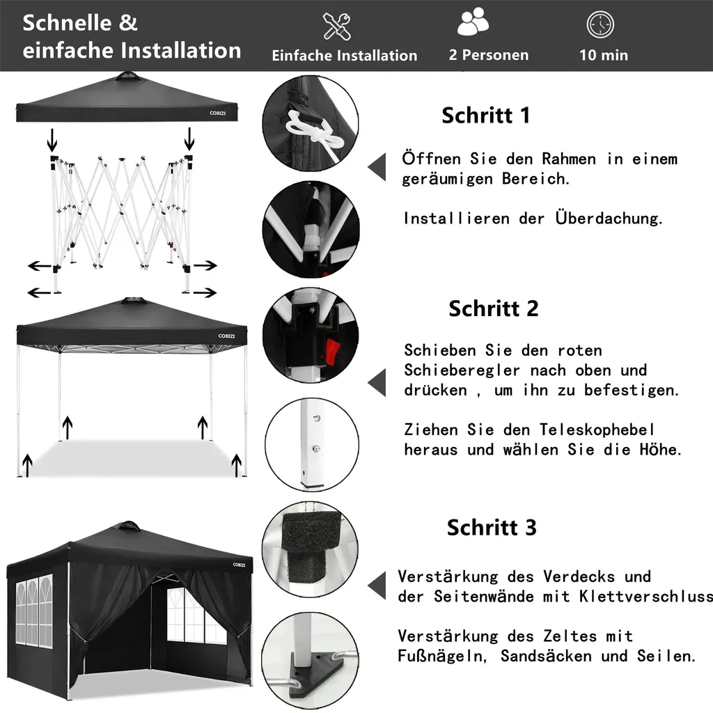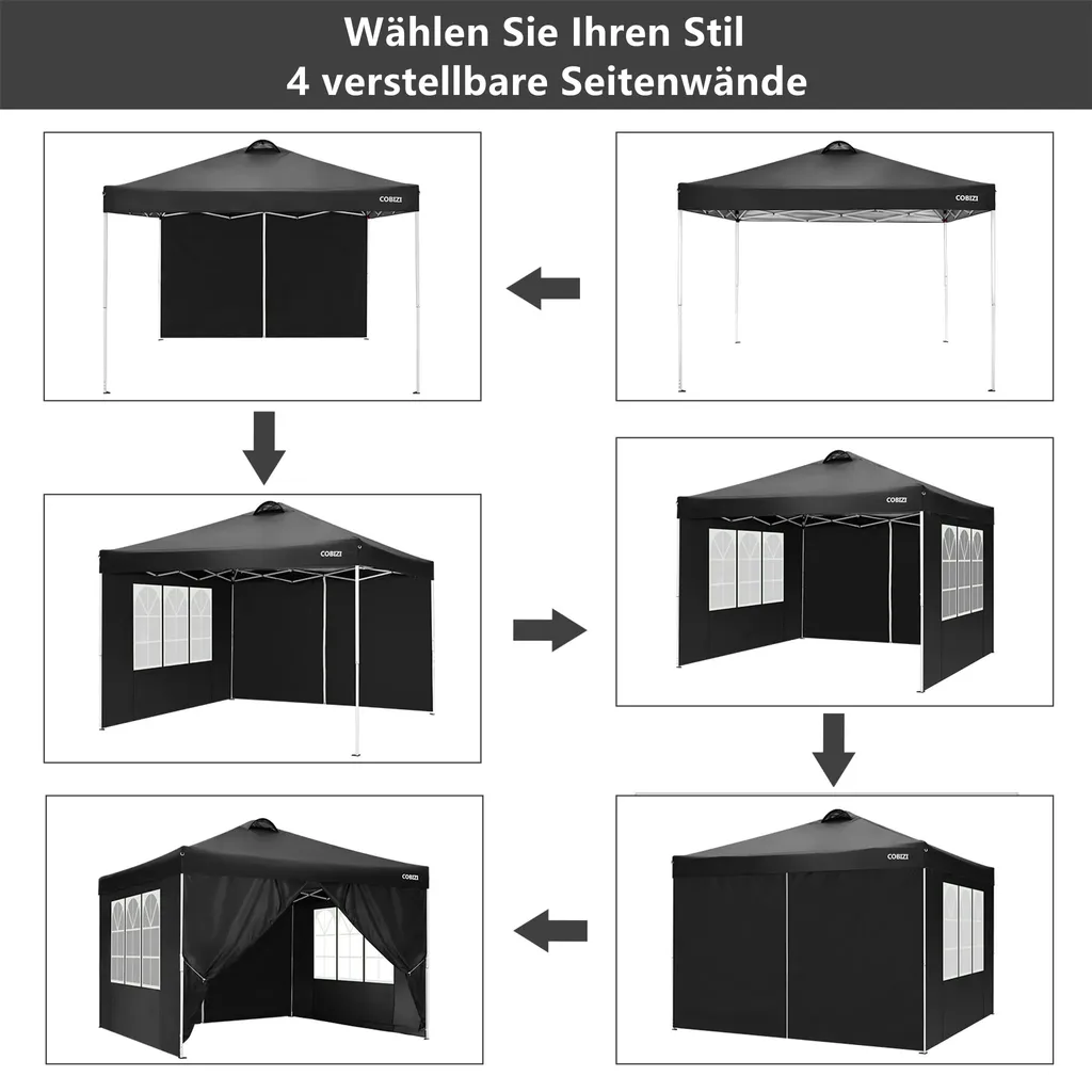 3x3m / 118.1×118.1inch Partyzelt, heben Sie das Zelt auf die gewünschte Höhe. 2 Sonnendach-Seitenwände und 2 Türwände mit zentralem Reißverschluss. Durch die Abnehmbarkeit können Sie den Pavillon je nach gewünschtem ungestörtem Schatten, Kühlung / Wärme einstellen.