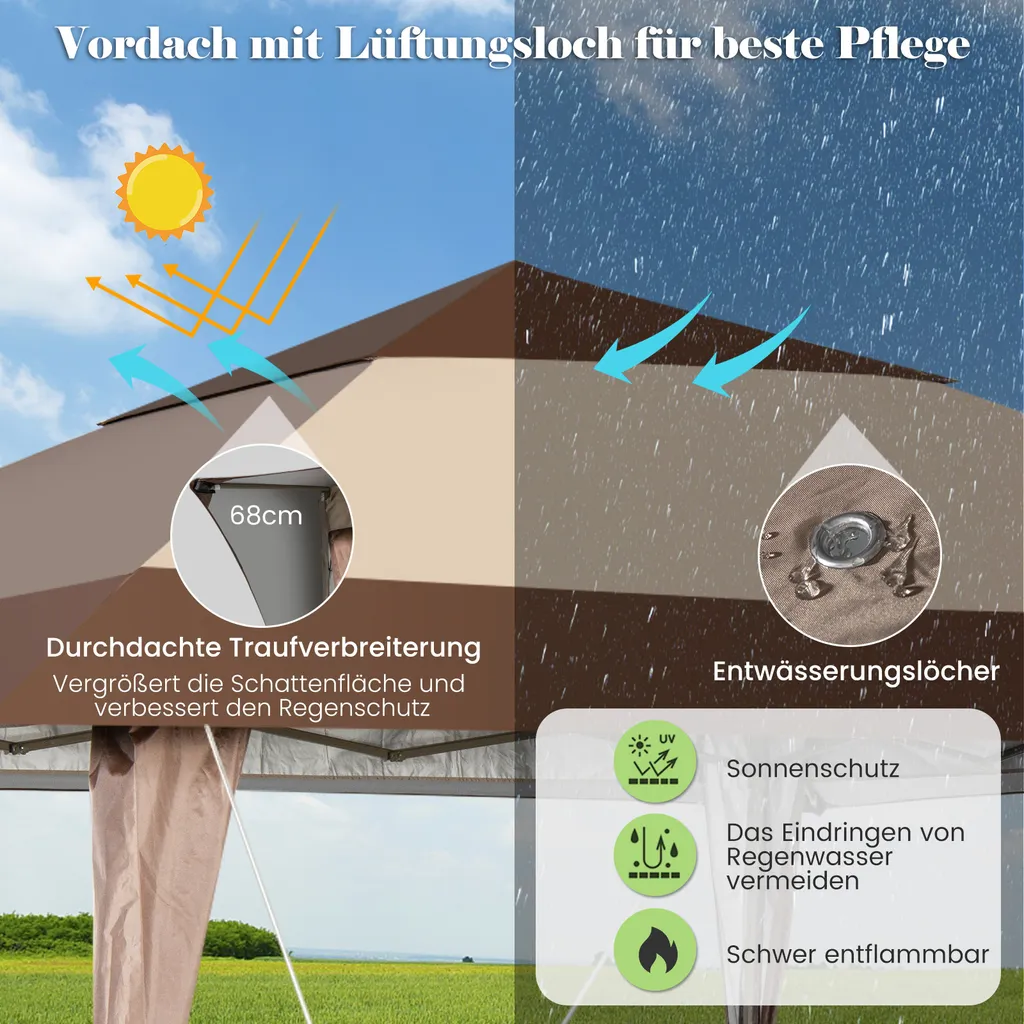 Mit 68 cm breiter Traufe bietet das 4×4 m große Pavillon 16 Quadratmeter Schatten für 8-10 Personen, die gleichzeitig vor Sonne oder Regen geschützt sind. Außerdem hat die Oberseite ein Belüftungsloch, durch das Innen- und Außenluft reibungslos strömen kann. Zusammen mit einem starken Metallrahmen steht der Pavillon stabil auf Ihrer Terrasse.