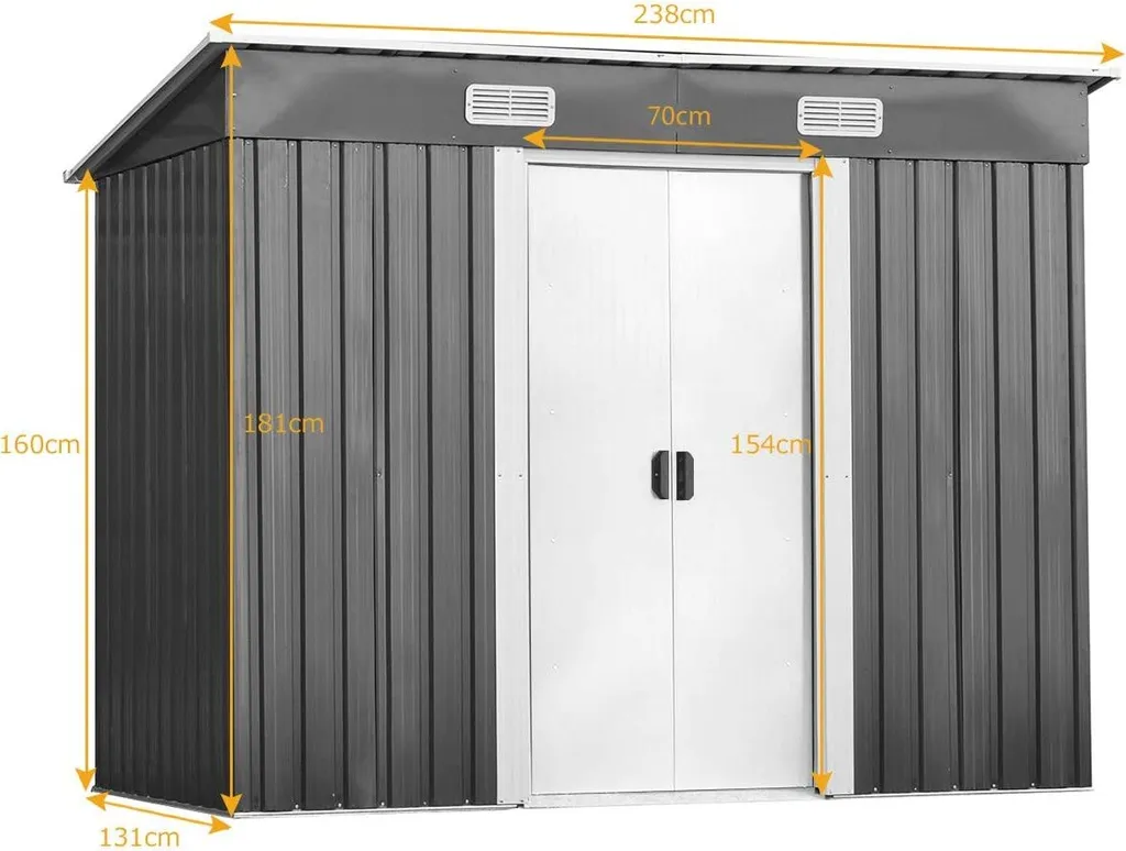 Die Maße des Gartenhaus betragen 238 x 131 x 181 cm. Das Gartenhaus bietet viel Stauraum für Ihre Gartengeräte, Werkzeuge, Waren, Pflanzen usw. Das Gartenhaus ist ein idealer Aufbewahrungsort für alle Gartenutensilien.