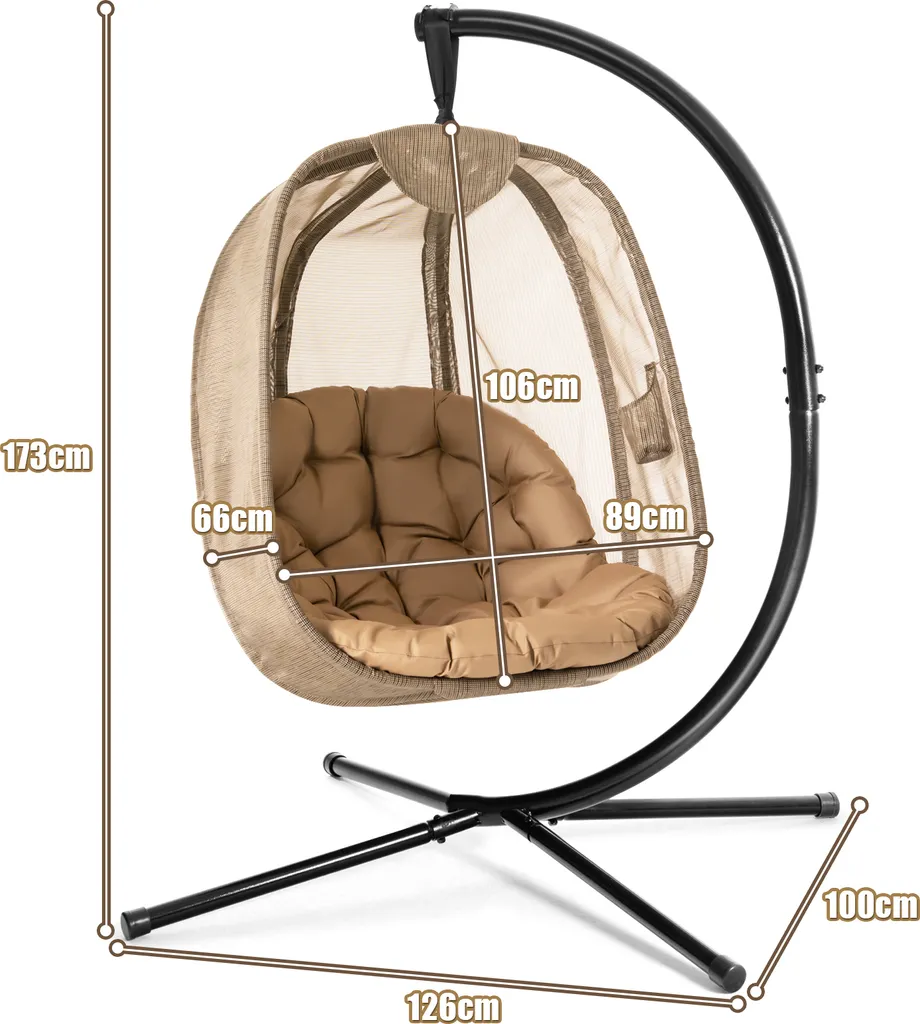 Unser Hängesessel ist eine wundervolle Wahl für Ihre Freizeit! Mit dem Stahlrahmen und dem X-förmigen Fuß ist er eine sichere und standfeste Sitzgelegenheit. Dank der weichen Polsterung können Sie sich wunderbar entspannen und der hochwertige Stoff ist verschleißfest und witterungsbeständig. Daher ist der Sessel eine optimale Ergänzung für Wohnzimmer, Terrassen, Höfe, Gärten, etc. Eine Anleitung und das benötigte Montagezubehör sind für einen einfachen Aufbau im Lieferumfang enthalten.