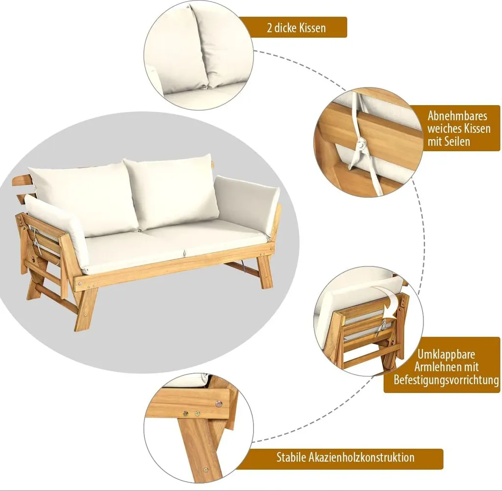 Benötigen Sie ein bequemes Schlafsofa für den Außenbereich? Diese Terrassenliege aus Holz ist genau das, was Sie brauchen. Ihr hochwertiger Akazienholzrahmen ermöglicht eine robuste und langlebige Struktur für den langfristigen Gebrauch. Mit einem geräumigen Sitz und einer ergonomischen Rückenlehne bietet sie ein komfortables Sitzerlebnis für den täglichen Gebrauch. Außerdem bringt die verstellbare Armlehne viel Komfort, da sie sich in ein Bett oder einen Liegestuhl verwandeln lässt, der Ihren unterschiedlichen Bedürfnissen gerecht werden kann. Darüber hinaus macht ihr rustikaler Stil sie zu einer perfekten Ergänzung für verschiedene Außenbereiche wie Hinterhof, Veranda, Balkon.