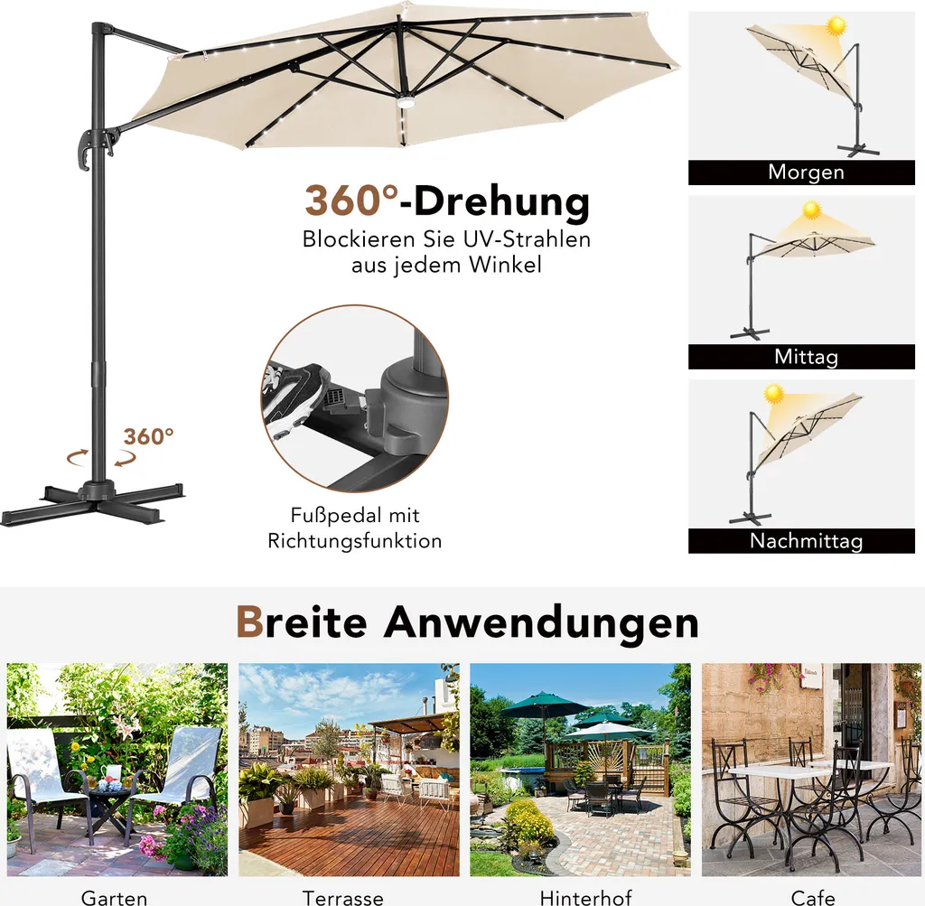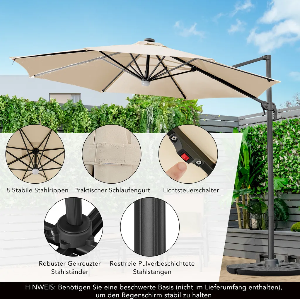 Unter unserem Terrassenschirm ist genügend Platz Tisch und Stühle, sodass Sie sich mit Freunden und Familie im Garten, auf der Terrasse, neben dem Pool oder am Strand hinsetzen können. Die 26 LED-Lichter und das Nabenlicht sind solarbetrieben. Dadurch sind sie besonders energiesparend. Der Schirm wird von 8 pulverbeschichteten Stahlrippen und einer Aluminiumstange getragen, die stabil und rostbeständig sind. Die Neigung ist dreifach einstellbar und der Schirm kann flexibel um 360° gedreht werden, dadurch ist eine stetige Anpassung an den Sonnenstand möglich.