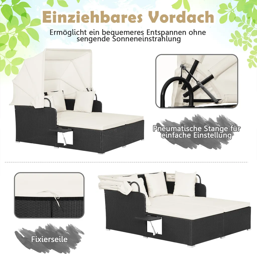 Als Highlight dieses Tagesbetts ermöglicht Ihnen das einziehbare Verdeck ein komfortableres Entspannen ohne sengendes Sonnenlicht. Die pneumatische Stange macht die Einstellung einfach und sicher.