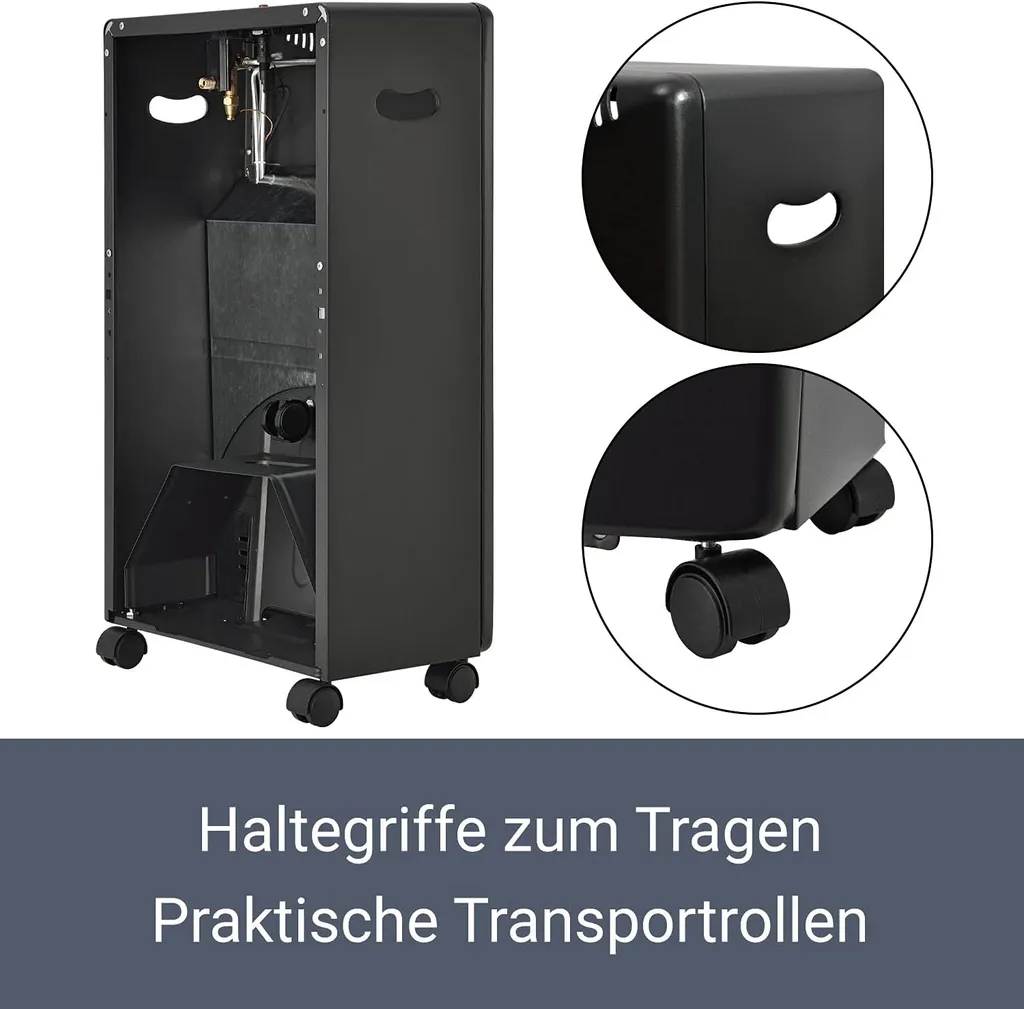 Durch die 2 seitlichen Griffe und 4 Rollen platzieren Sie das mobile Gasheizgerät einfach auf überdachten Terrassen etc. Sichern Sie das Gerät dabei gegen Umkippen und Wegrollen.