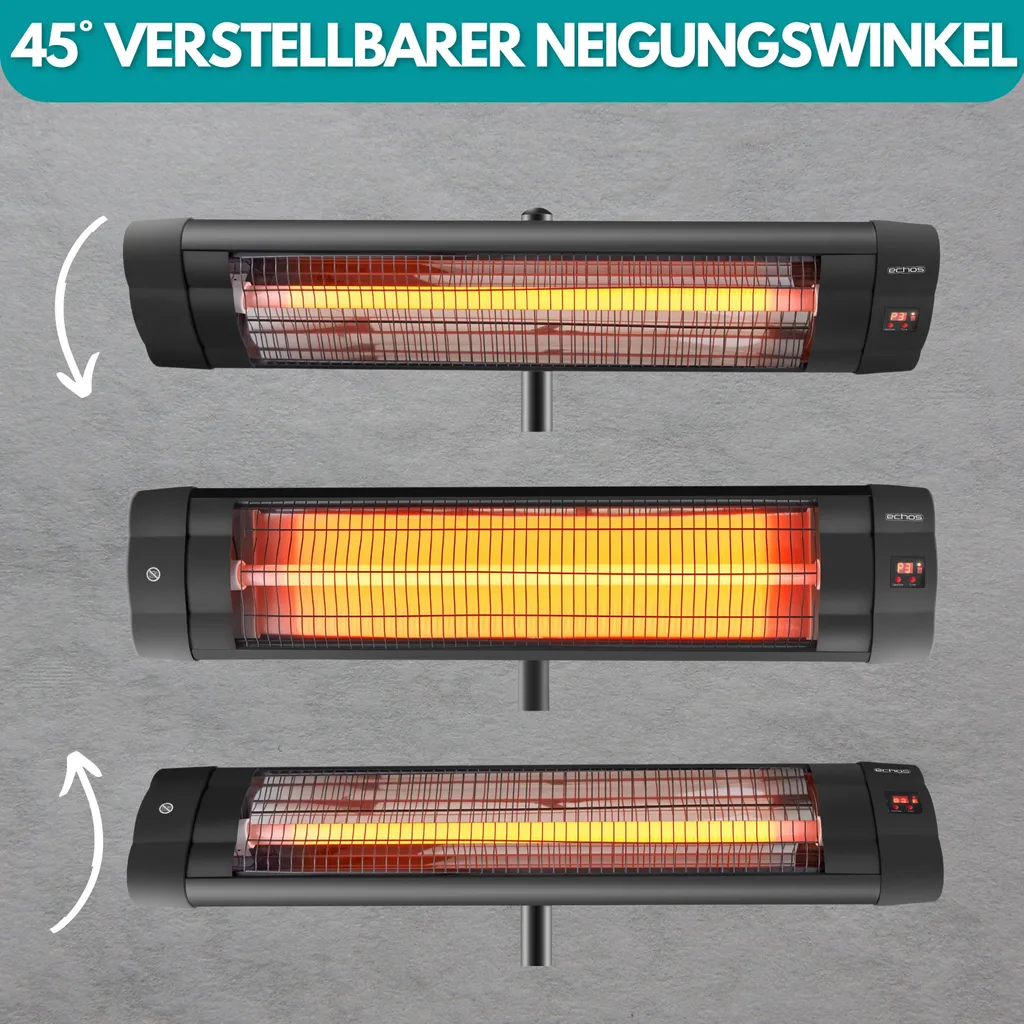 Ebenso verfügt dieser Heizstrahler über ein gut ablesbares Display und eine mitgelieferte Fernbedienung mit 24h Timer . Des Weiteren befindet sich das Wand bzw. Deckenmontageset im Lieferumfang.