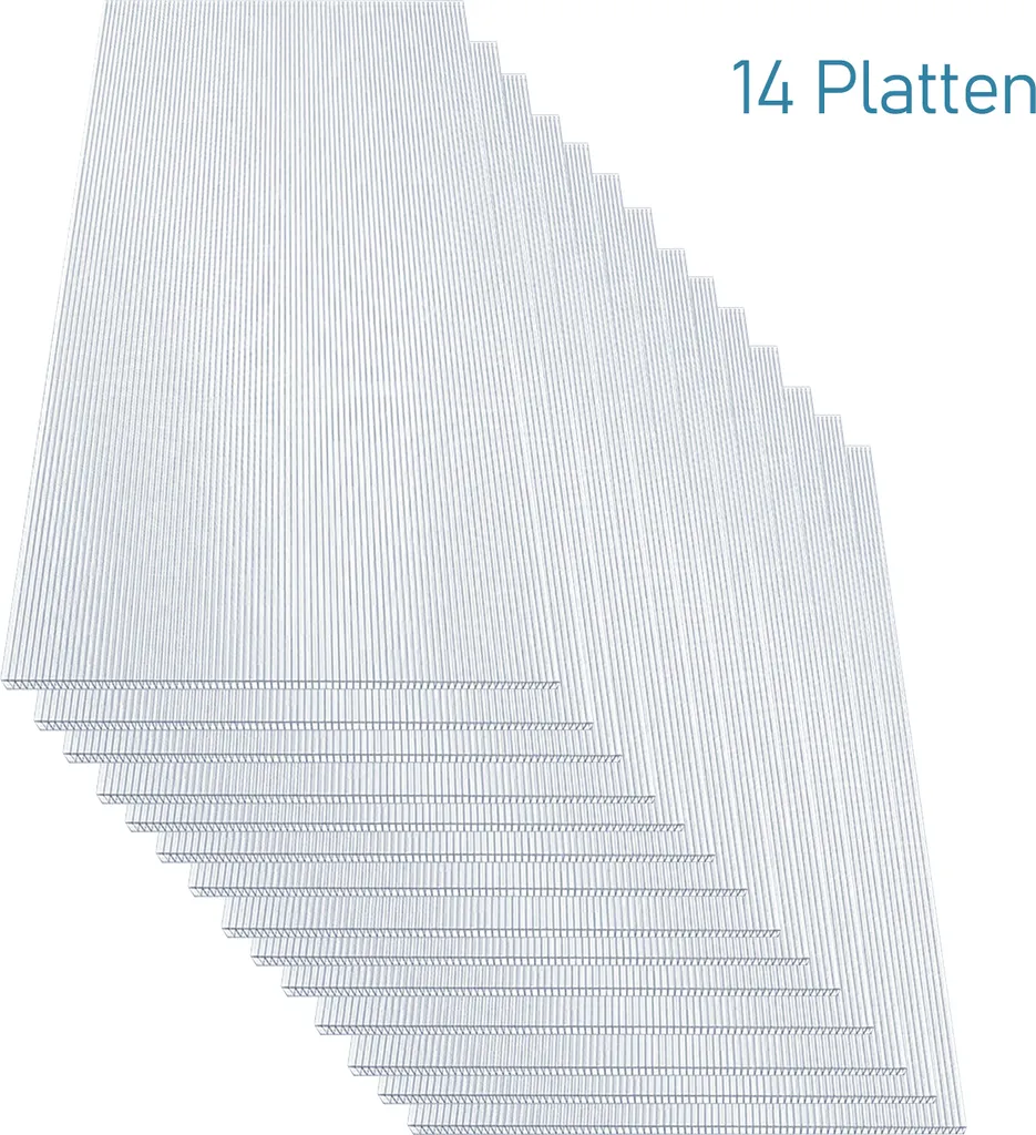 √ Lieferumfang: 14x Hohlkammerstegplatten je 60,5 x 121cm, 4mm dick, Flächengewicht: 700g/m², transparent.