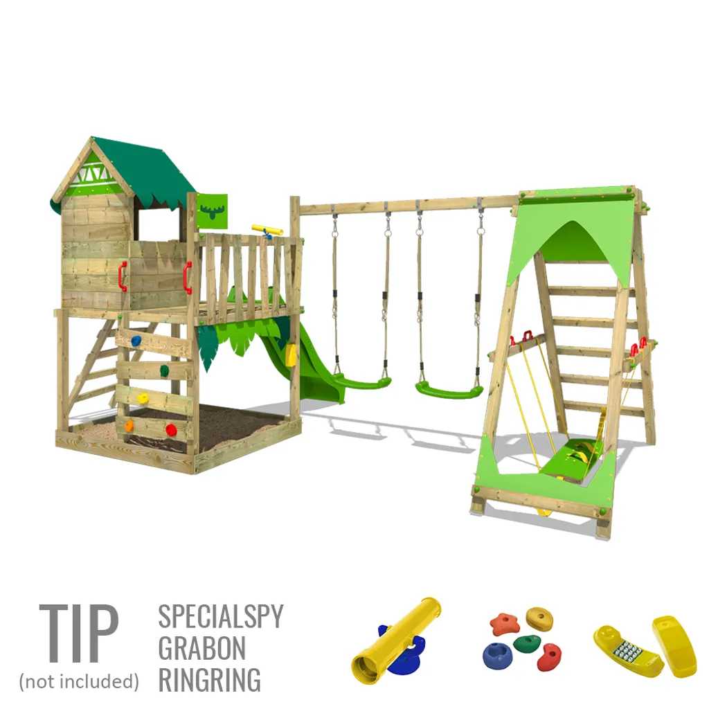 Wenn es oben einmal zu heiß wird, ist auch das kein Problem: Über die Wellenrutsche geht es blitzschnell wieder hinunter, wo du im kühlen Sand relaxen kannst. Aber etwas fehlt noch, um den ultimativen Dschungel-Spaß komplett zu machen: Auf der Schaukel saust du durch die Lüfte wie Tarzan höchstpersönlich. Fast so, als würdest du an einer Liane durch den Dschungel gleiten.
