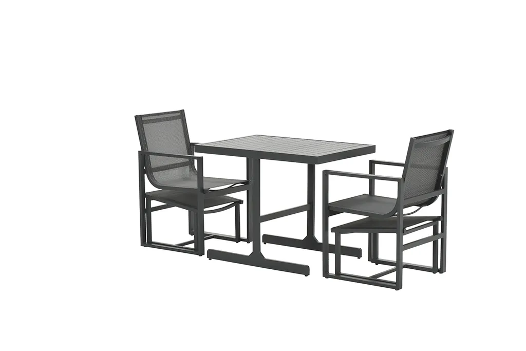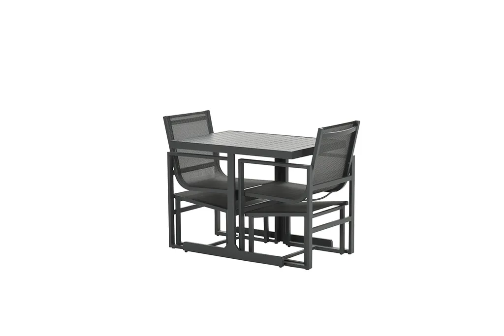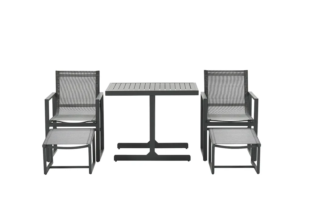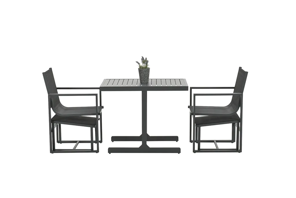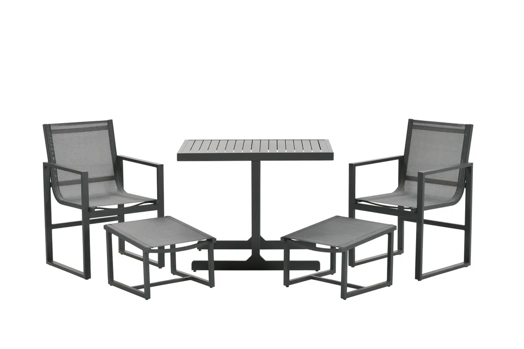 – Weitere Eigenschaften: UV-beständig, – witterungsbeständig: Ja, – zusammenklappbar: Nein, – Farbe: carbon black, – Stühle stapelbar: Nein, – Tisch höhenverstellbar: Nein, – Im Set enthalten: 1 Tisch, 2 Stühle, 2 Fußbänke, – Maße: Tisch: 95,5x65x75 cm, Stühle: 56x63x88,5 cm, Fußbank: 46×52 cm, – Material: pulverbeschichtetes Aluminium