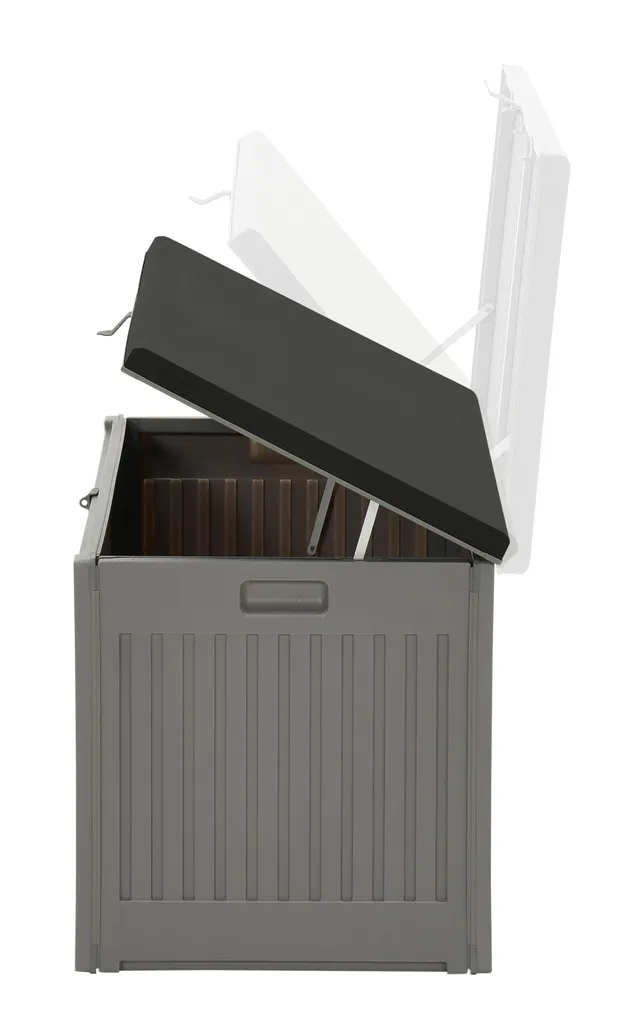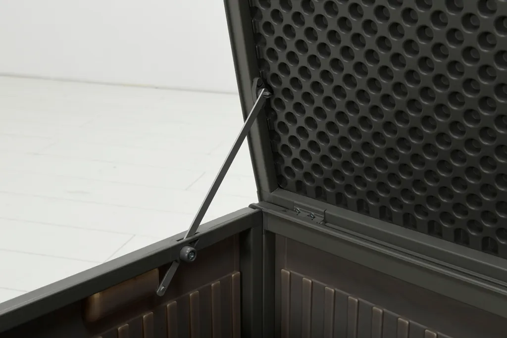 Die Box besteht aus Kunststoff und ist pflegeleicht, langlebig und wetterbeständig. Der Deckel ist leicht zu öffnen und ist abschließbar an der Vorderseite. Die Kissenbox ist komplett wasserdicht und outdoor-geeignet.