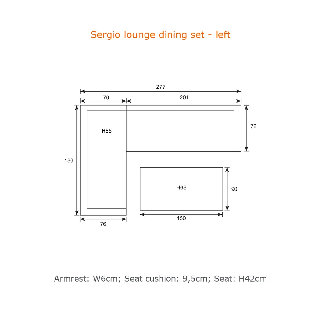 In der Dining-Loungeserie Sergio sind ein passender Sessel und ein Sofa erhältlich. Das Set ist auch in einer gespiegelten Version erhältlich. Fragen Sie uns nach den Möglichkeiten.