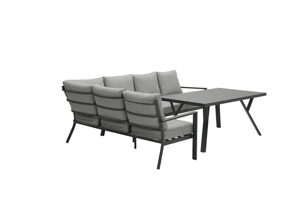 Mit dem Dining-Loungeset Sergio können Sie sich entspannen und essen. Dieses Loungeset aus Aluminium hat ein modernes Design und wunderbar weiche Kissen. Das Set besteht aus einem großen Ecksofa und einem hohen Esstisch.