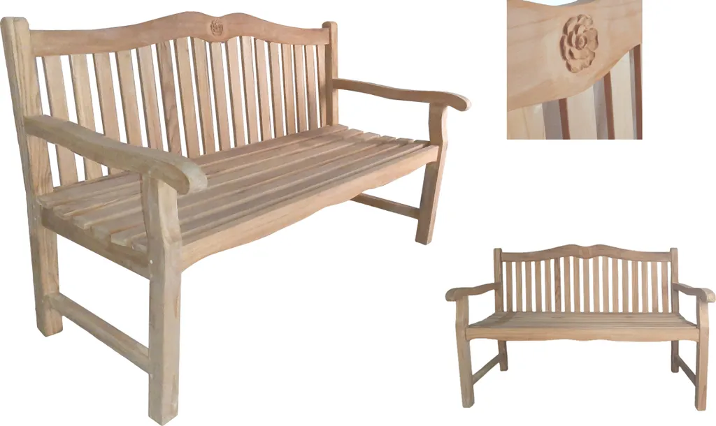 Die geschwungene Rückenlehne ist ein Highlight der Gartenbank, ein wunderschön geschnitztes Blumenmotiv ziert die Rückenlehne noch zusätzlich.