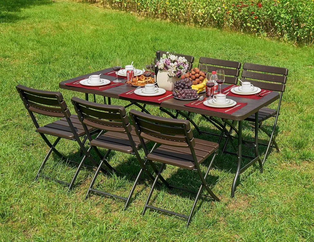 Der Tisch lässt sich durch sein Klappsystem mit Tragegriff und einer sehr gute Verstaubarkeit ideal im Innen- oder Außenbereich einsetzen. Durch sein Material ist der Tisch absolut wetterfest. Maße Tisch: 180 x 74,5 x 73 cm (L x B x H). Farbe: Holz-Optik.