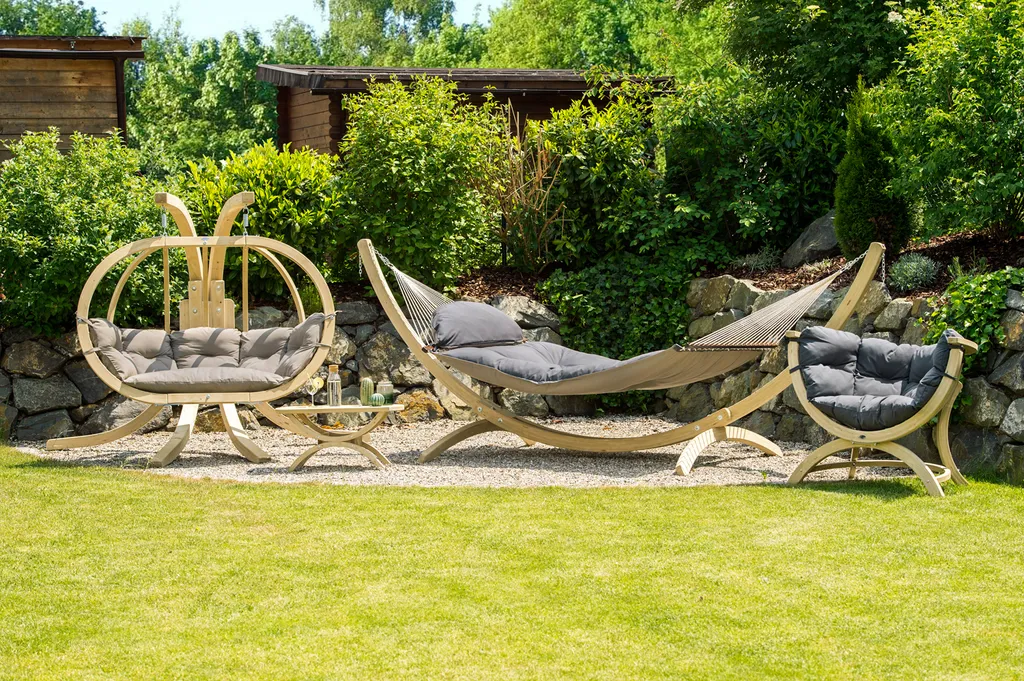Globo Royal Chair Hängesessel von Amazonas Edles in sorgfältiger Handarbeit hergestelltes Kugelgestell aus wetterfest behandelter Fichte. Die hochwertige Schichtverleimung sorgt für höchste Stabilität und Sicherheit. Mit wasserabweisender Füllung. Inklusive Spiralfeder. Produktinfomation: Material: Holz: tauchbadimprägniertes Fichtenholz, hochwertige Schichtverleimung Beschläge: korrosionsgeschützt verzinktes Metall Kissen: Stoff (anthracite/taupe): 100 % spinndüsengefärbtes Polyacryl Füllung: 100 % Polypropylen (Stoff) / 100 % Polyester (Füllmaterial) wasserabweisende Füllung Kombinierbar mit: Gestell: Globo Royal Stand Zubehör: 2x Jumbo / 2x Easy+ / 2x Liana / 1x Globo Royal Cover Beistelltisch: Tavolino Abmessungen: ca. 176 x 118 x 72 cm Belastbarkeit: max. 200 kg Gewicht: ca. 25,8 kg Kissen-Farbe: taupeSerieSienaGestellNein