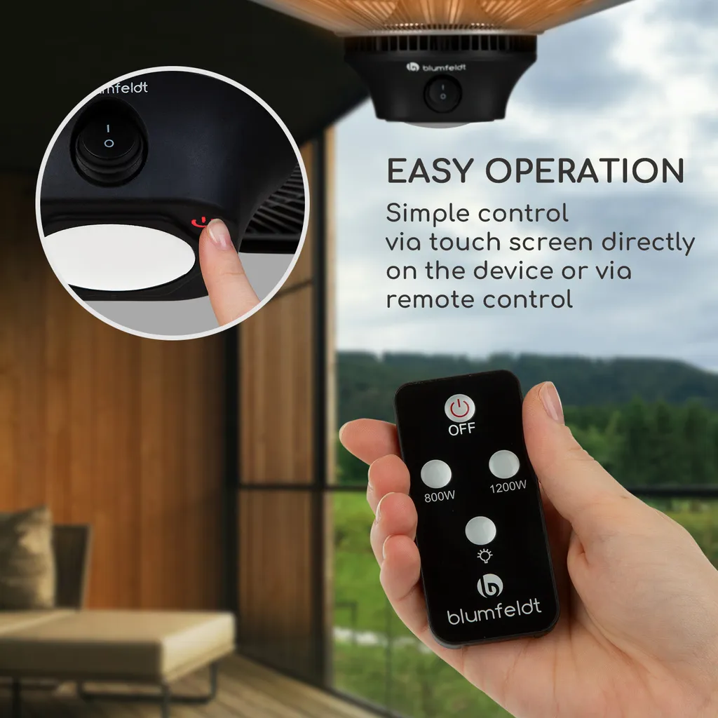 Angenehm wie die Sonne: IR Comfort Heat wärmt dich und deine Gäste auch an kühlen Tagen mit gesunden Infrarotstrahlen, Kraftvoll nach Wahl: Decken-Heizstrahler mit 3 Leistungsstufen bei 800, 1200 und 2000 Watt, Easy Control: einfache Steuerung per Touch-Screen direkt am Gerät oder per Fernbedienung, Sichere Wärme im Freien: robustes Stahlgehäuse mit Schutzart IP34, Infrarot-Halogen-Heizelemente: hocheffizient und langlebig mit extrem schneller Aufwärmphase, Licht im Dunkel: integrierte, separat schaltbare LED-Lampe, Bis spät in die Nacht: geselliges Zusammensein auch an kühlen Abenden dank 2000 Watt Wärmeleistung, Flexibel an der Decke: mit 50 cm Kette und Karabinerhaken