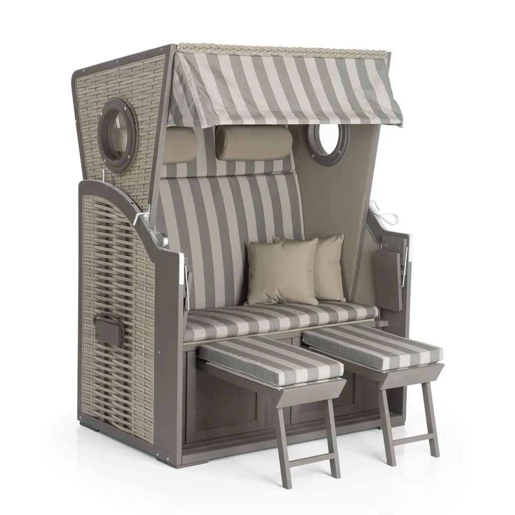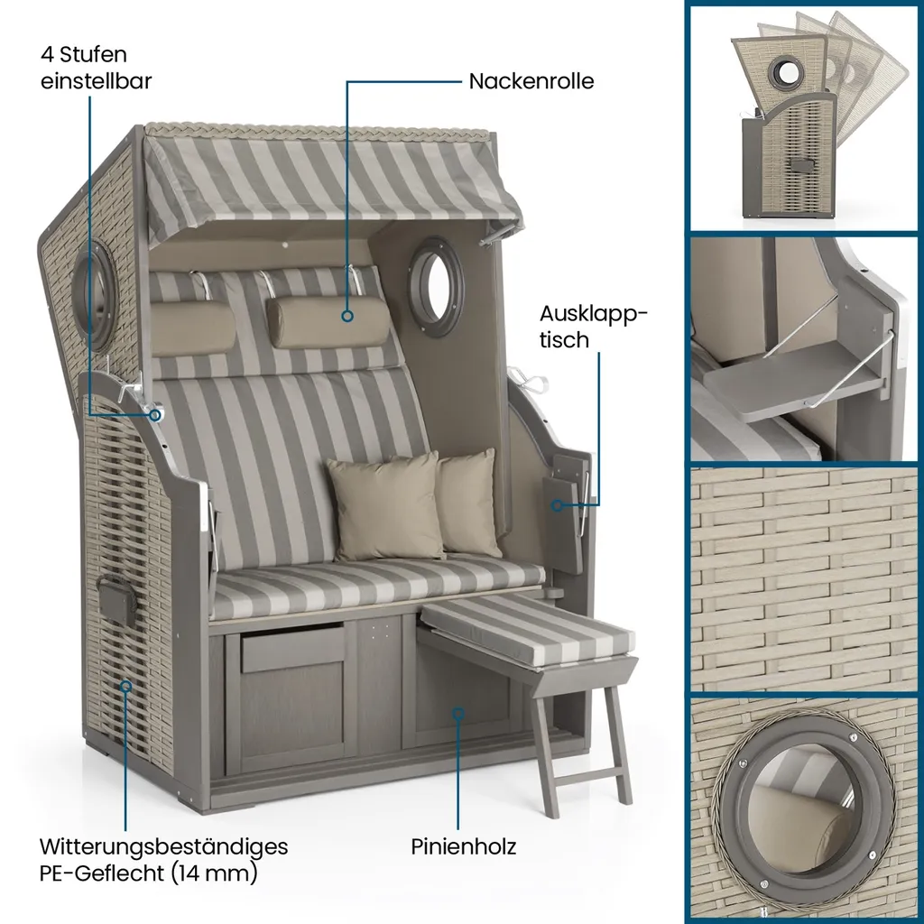 - Lieferumfang: 1x Strandkorb, 2x Kissen, 2x Fußstützkissen, 2x Nackenrollen, Montagematerial