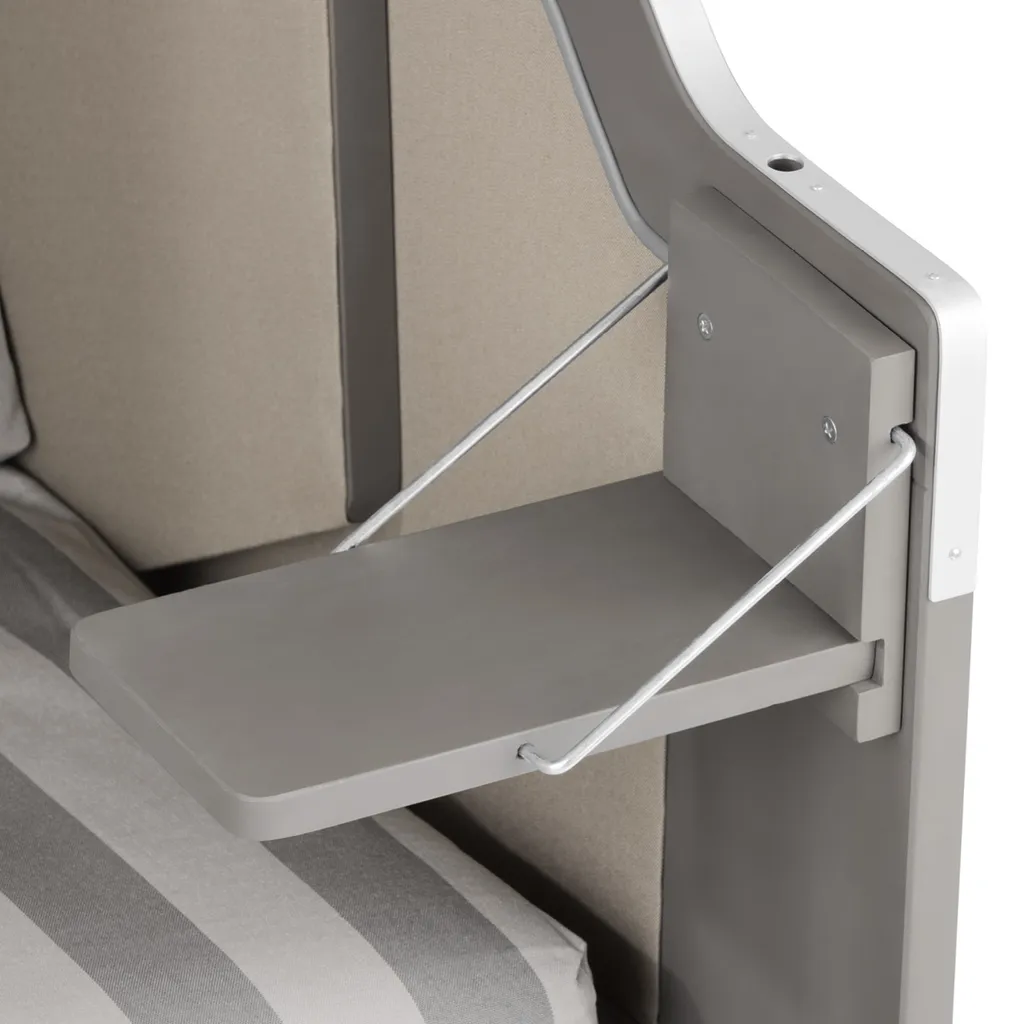 Die umfangreiche Ausstattung umfasst 2 ausziehbare Fußbänke, 2 Fußstützkissen, 2 Nackenrollen, 2 ausklappbare Tischchen an den Seiten sowie 2 zusätzliche Kissen.