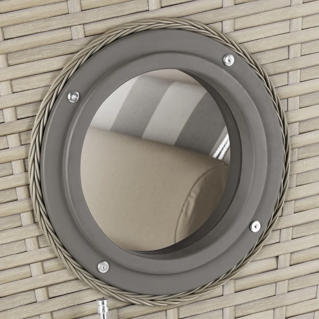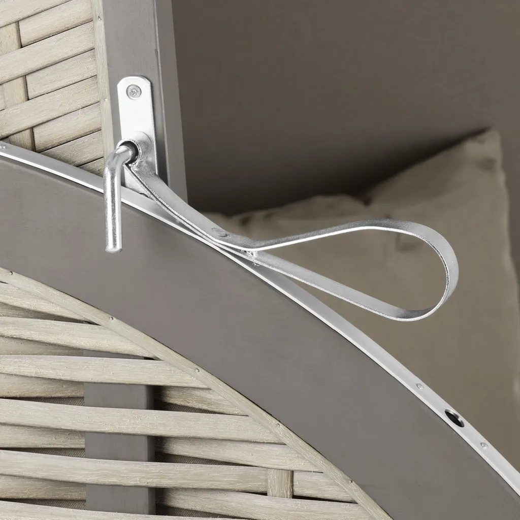 Außerdem behältst du mit den zwei Bullaugen an den Seiten immer den Überblick. Der Neigungswinkel der Rückenlehne kann in 4 verschiedenen Stufen eingestellt werden. Das Material besteht aus robustem Pinienholz und einem PE-Geflecht, das witterungs- und UV-beständig und besonders pflegeleicht ist.