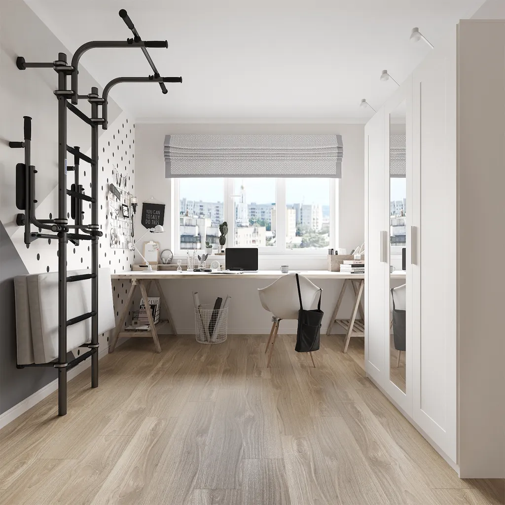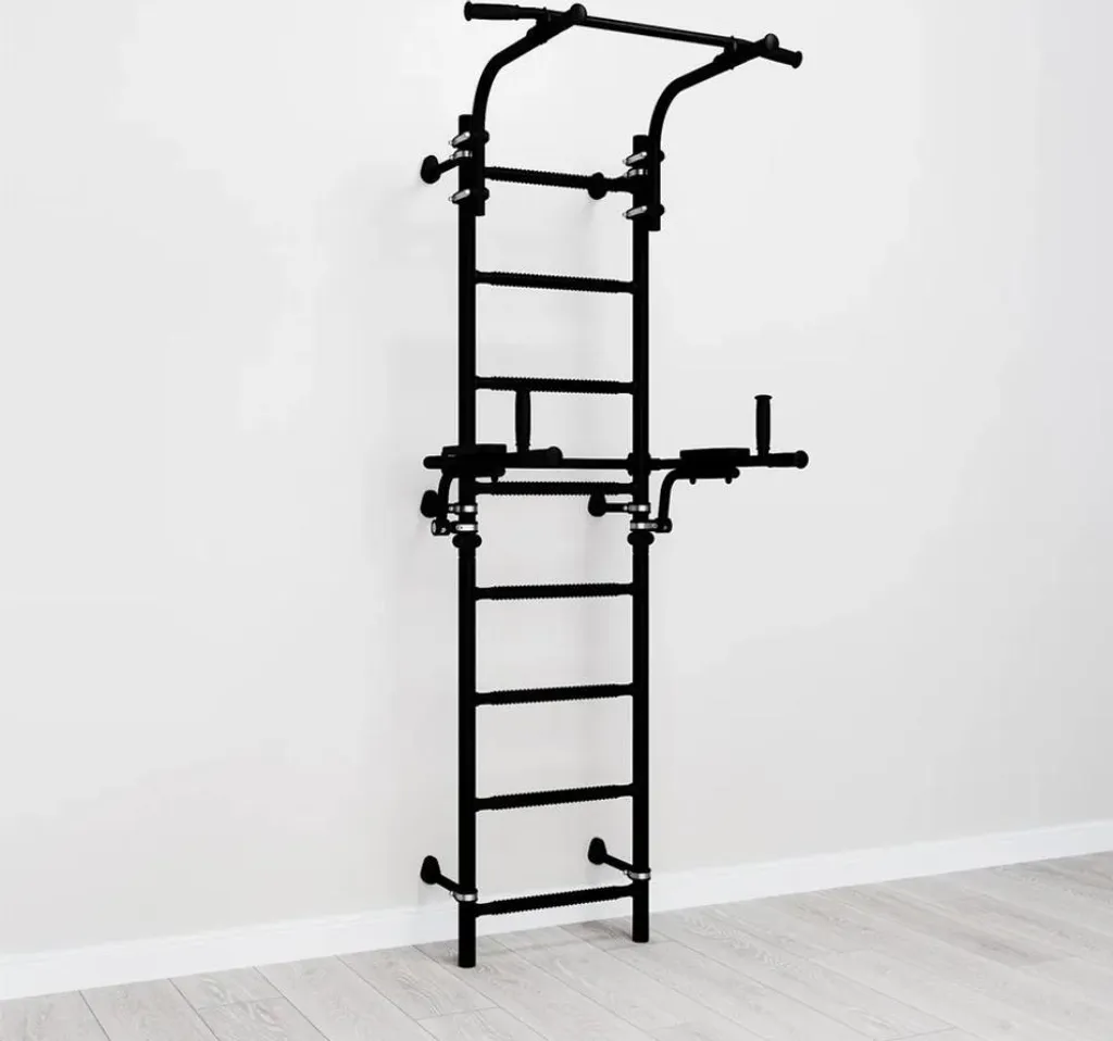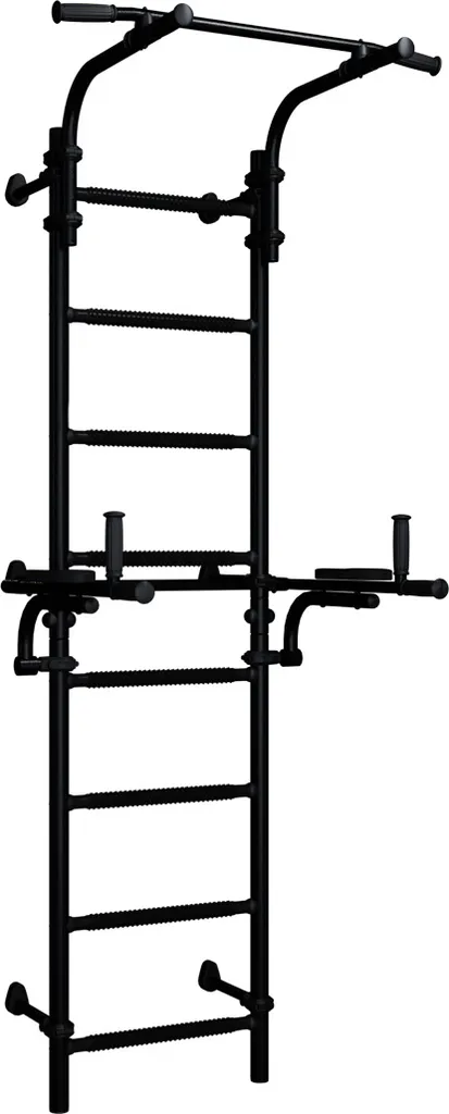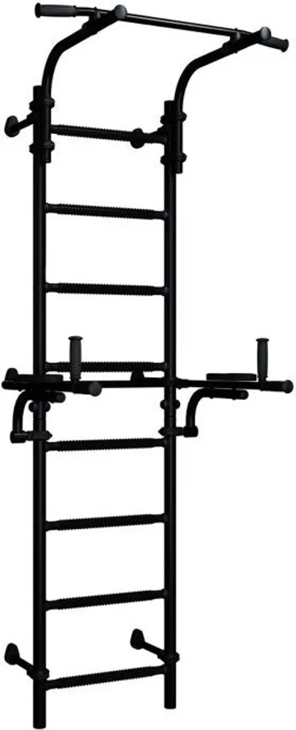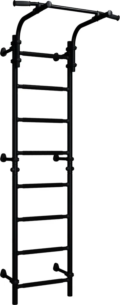 Die Sprossenwand mit Reck und Dipstation Athlet 1W aus hochwertigem Metall in edler mattschwarzer Optik kann selbst auf engstem Raum aufgestellt werden. Einfach die einzelnen Elemente zusammenstecken und das Klettergerüst an die Wand montieren.