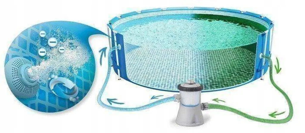 Zu dem Pool-Set gehört eine Filterpumpe mit Filterkartusche, die mit den mitgelieferten Schläuchen, Schlauchschellen und Schlauchverbindern direkt benutzt werden kann, um das Poolwasser ab dem ersten Tag zu reinigen.