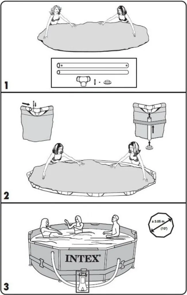 Der Rahmen der Intex Metal Frame Pools besteht aus Rohre aus pulverbeschichteten Stahl. Die Rohre werden ganz einfach in die Verbindungsstücke aus Kunststoff gesteckt und schon steht der ganze Rahmen fest und sicher. Die verbesserten Verbindungsstücke sorgen zudem für eine wasserdichte Verbindung der Rohre, so dass kein Rost entsteht.