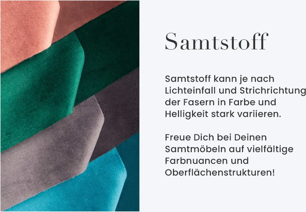 Hinweis: Samt ist ein ganz besonderer Bezugsstoff mit einzigartigen Eigenschaften. Helligkeit und Intensivität der Farbe kann variieren und es können sich einzigartige Muster auf dem Soff abbilden – je nachdem, in welche Richtung die feinen Fasern gestrichen wurden und wie der Stoff ausgeleuchtet wird. Das Ergebnis ist eine individuelle Komposition aus Farbnuancen und Oberflächenstrukturen, die Dein Möbelstück immer in einen faszinierenden Blickfang verwandeln..