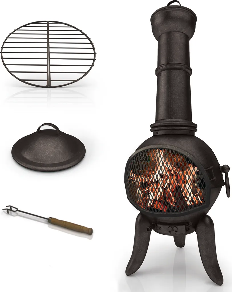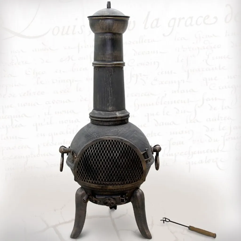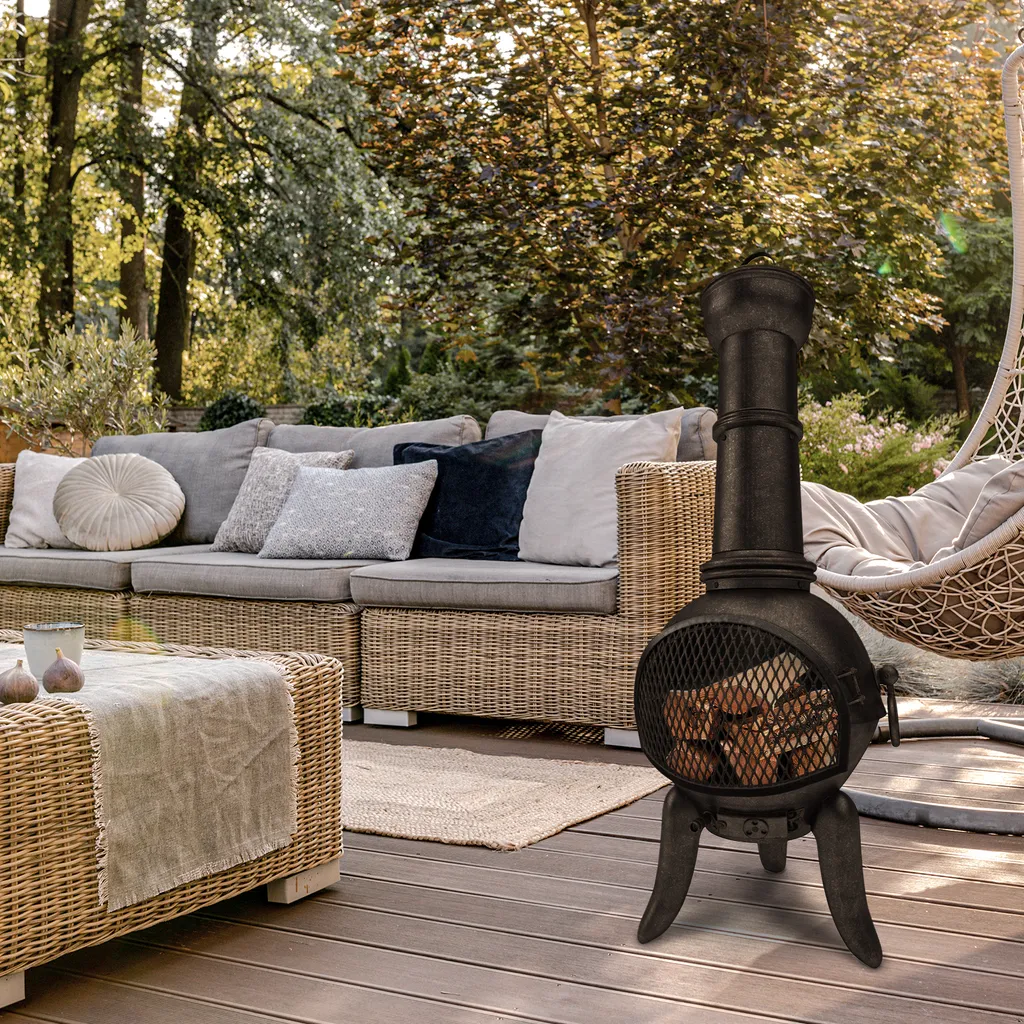 Der Terrassenofen erinnert an frühere Zeiten und bringt mit seiner rustikalen Optik ganz viel Gemütlichkeit in den Garten oder auf die Terrasse. Im Bauch des kompakten Ofens lässt sich ein Feuer entzünden. Das verschließbare Gitter gibt den Blick auf die knisternden Flammen frei und schützt vor herausspringender Glut. Durch den Schornstein kann der Rauch entweichen. Der gusseiserne Terrassenofen ist das perfekte Accessoire für kühlere Sommernächte, einen schönen Abend im Frühling oder einen warmen Herbstabend. Das robuste Material sorgt für eine gute Wärmeabstrahlung.