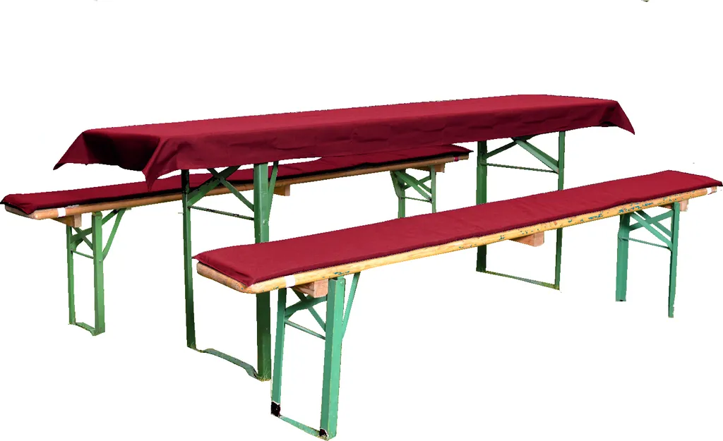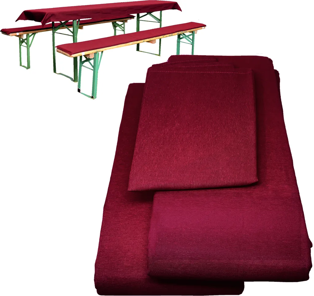 - DETAILS: 2x Bierbankauflagen, 1x Tischdecke / Maße: Tischdecke: 90 x 240 cm / Material: Oberstoff: 70 % Polyester. 30 % Baumwolle ( 100 Standard), Füllung: 100 % Polyurethan-Schaum / Farbe: Bordeaux