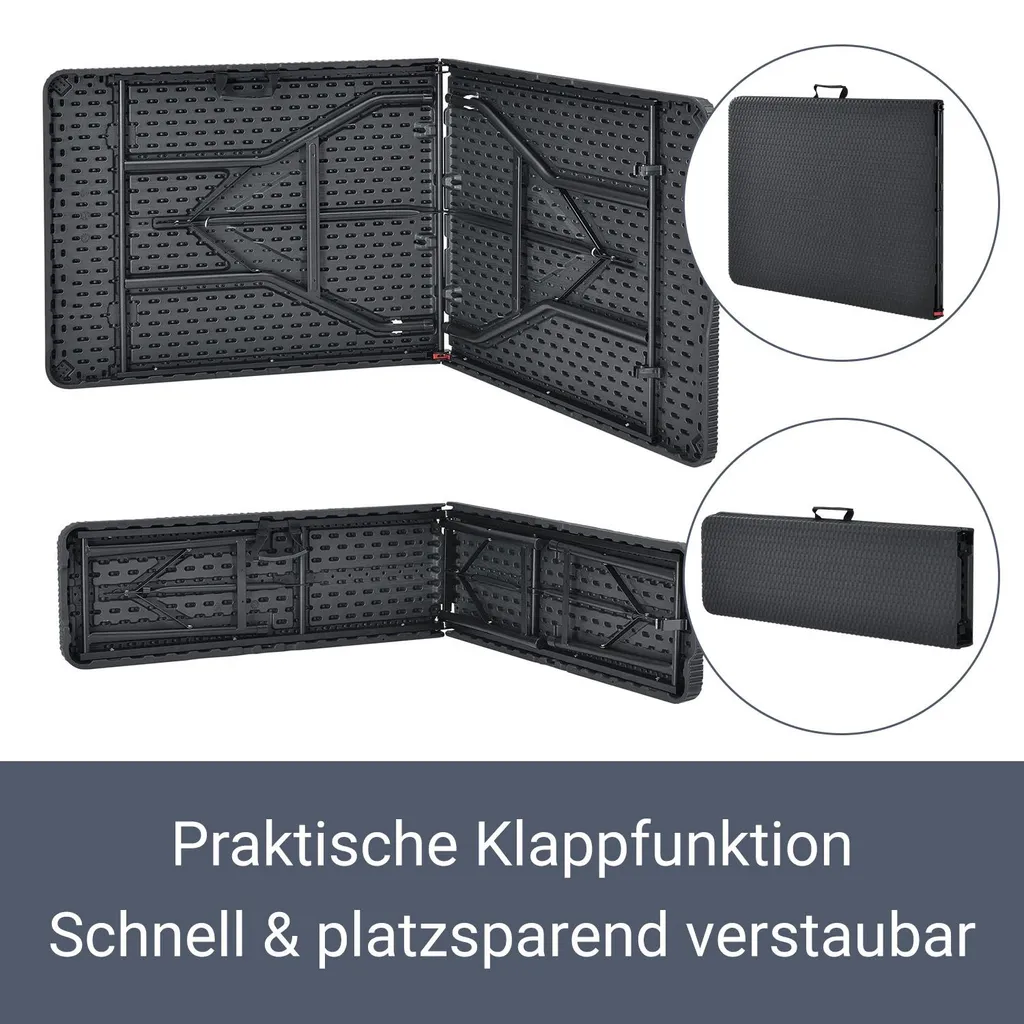 Ob Geburtstagsfeier, Grillabend oder beim Camping – die klappbare Bierzeltgarnitur Amberg aus einem großen Tisch und zwei Bierbänken in Rattan-Optik lädt zum gemütlichen Beisammensein ein. Die 3-teilige Sitzgarnitur ist schnell im Garten, auf dem Balkon oder der Terrasse aufgebaut. Hinterher lässt sich das Gartenmöbel-Set durch die Kofferfunktion wieder platzsparend verstauen. Tragegriffe und das geringe Gewicht ermöglichen einen hohen Tragekomfort. Bodenschoner verhindern unschöne Kratzer auf dem Boden. Somit ist die Festzeltgarnitur auch Innen einsetzbar.