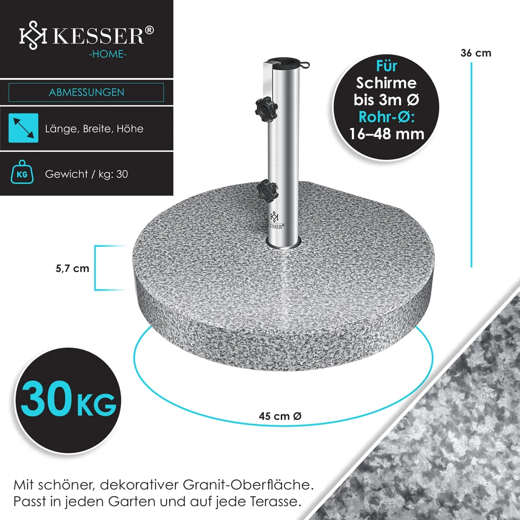 KESSER Sonnenschirmständer Granit, hohe Flexibilität dank zwei Adapterringen für viele Schirme passend, leichter Transport dank Edelstahlgriff und Rollen, auch bei starken Windböen standfest, mehr Sicherheit durch gefaste Oberkanten