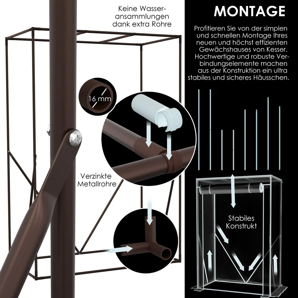 HOCHWERTIG UND ROBUST: Profitieren Sie von der simplen und schnellen Montage Ihres neuen und höchst effizienten Gewächshauses von KESSER. Die hochwertigen und robusten Verbindungselemente machen aus der Konstruktion ein stabiles und sicheres Treibhaus. Durch zusätzlich angebrachte Rohre ist die Wasseransammlung ausgeschlossen und metallverzinkte Rohre sorgen für ein langlebiges Glashaus.