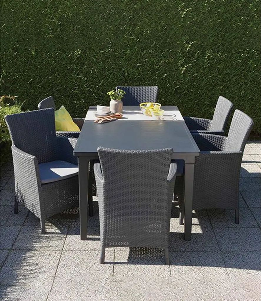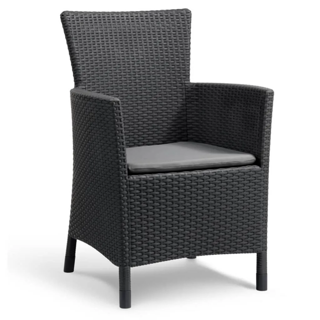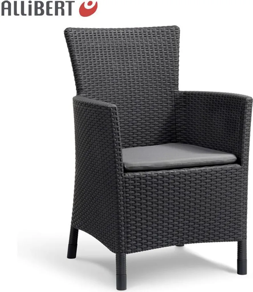 Der Allibert Dining Chair Montana in der Farbe Graphite/Cool grey ist aus hochwertigem Kunststoff in Rattanoptik gefertigt. Der gemütliche Sessel ist UV- und wetterbeständig und zeichnet sich durch die ergonomische Rückenlehne aus. Der hochwertige Kunststoff kann weder rosten noch ausfransen. Im Lieferumfang ist das passende Sitzkissen enthalten. Nach der schnellen und einfachen Montage lädt der Dining Chair zu einer gemütlichen Zeit im Garten und auf der Terrasse ein. Der Sessel kann ganz individuell mit anderen Gartenmöbeln in Rattanoptik kombiniert werden.
