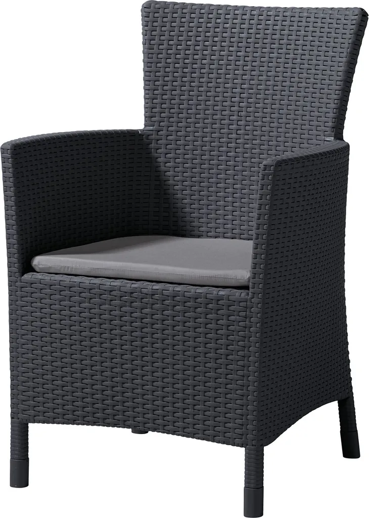 Der Stuhl hat bequeme Armlehnen und eine ergonomisch geformte Rückenlehne für hohen Sitzkomfort. Ein passendes Kissen ist im Lieferumfang enthalten. Dieser bequeme Gartenstuhl ist aus verschleißfestem, wetterbeständigem und wartungsfreiem Kunststoff gefertigt. So hält er jahrelang, ohne zu verschleißen oder zu rosten. Mit seinem modernen Design passt der Gartenstuhl zu jedem Gartenmöbel-Set und jedem Tisch im Freien.