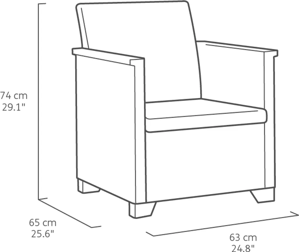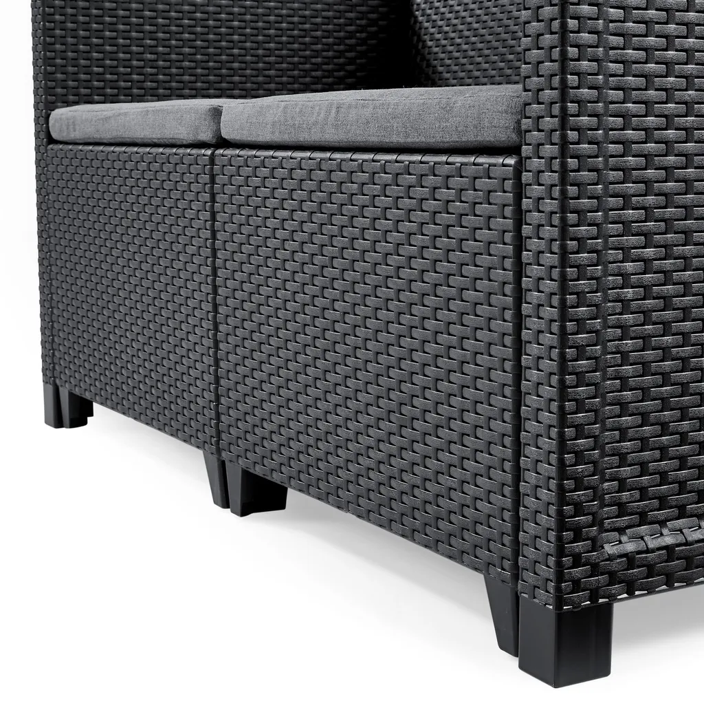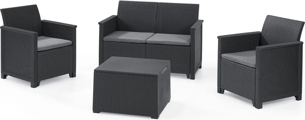 Keter Lounge Set Emma 8-teilig – graphit , 2 Sessel + 2er Sofa + 1 Tisch mit Aufbewahrungsbox-Funktion + 4 Sitzauflagen