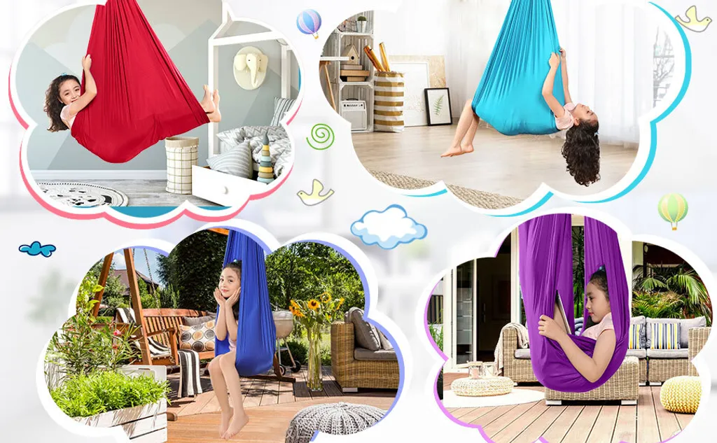 Die Hängematte hilft dem Kind, Körperbewusstsein, Gleichgewicht, Motorik und räumliche Fähigkeiten zu erlernen.