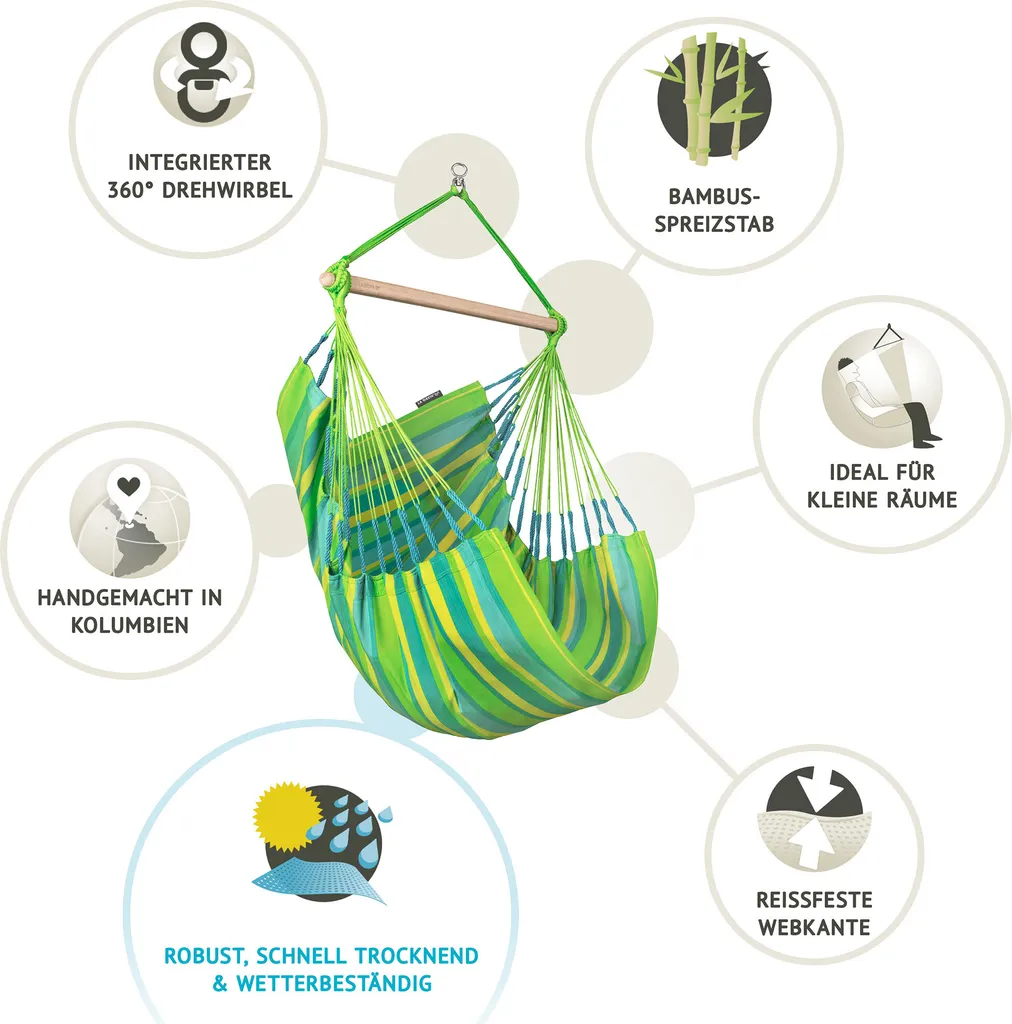Finde deinen perfekten Hängestuhl! Der perfekte Begleiter für entspannte Stunden im Garten aus pflegeleichter Outdoor-Faser. Die wetterbeständige Funktionsfaser von La Siesta wurde speziell für die besonderen Anforderungen an Outdoor-Hängematten und Hängesesseln entwickelt. Sie ist einfach zu pflegen, schnelltrocknend und wetterbeständig. Durch Verdopplung der Schussfäden sind die Webkanten verstärkt und daher besonders reißfest.