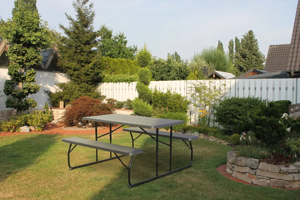 Die zusammenklappbare Bierzeltgarnitur hat einem stabilen Stahlrahmen. Die Tischplatte und Sitzflächen sind aus hochwertigem HDPE-Kunststoff (Polywood) mit Holzstruktur. Geeignet u.a. für Picknicks, Camping, Partys, Grillen im Freien, Catering und andere Anlässe. Bequem , platzsparend und leicht zu reinigen.